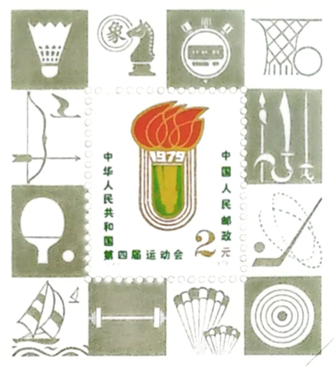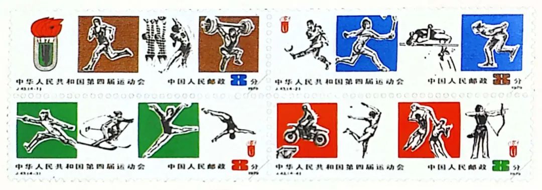 邮电部发行《中华人民共和国第四届运动会》纪念邮票一套,共四枚。这四枚彩色邮票画面由这届运动会会徽和田径、球类等十五个有代表性的运动项目分别组成,面值都是八分。为满足国内外集邮爱好者的需要,同时发行《中华人民共和国第四届运动会》纪念邮票小型张一枚,面值二元,也是彩色影写印制的。