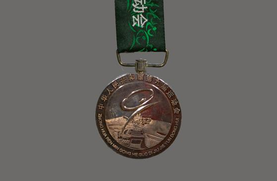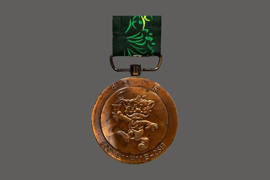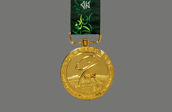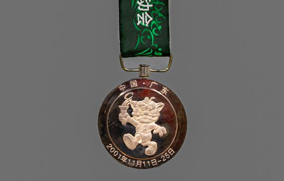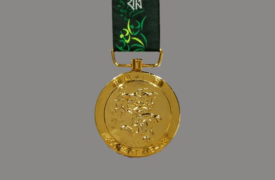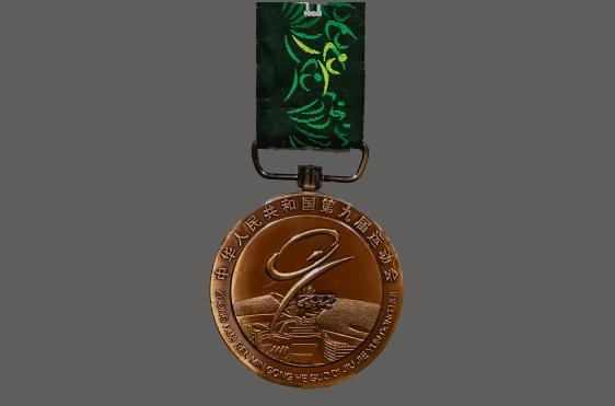 奖牌直径6cm,厚0.4cm。正面中心位置印有第九届全运会会徽,会徽用简约的线条,勾勒出一个“9”字,寓意第九届全运会,线条呈现中间丰满,两端渐细的曲线,带给人无限的延伸感,配合倾斜的线条,更显奔腾飞跃之意,宛如一位矫健、充满活力、奋发向上的运动员,豪迈跨入新世纪。奖牌正面背景为举办本届全运会开幕式的广州奥林匹克体育中心。背面刻有以广东醒狮为原型的九运会吉祥物“威威”,极具地方文化特色,代表着新世纪我国体育事业的全面发展。