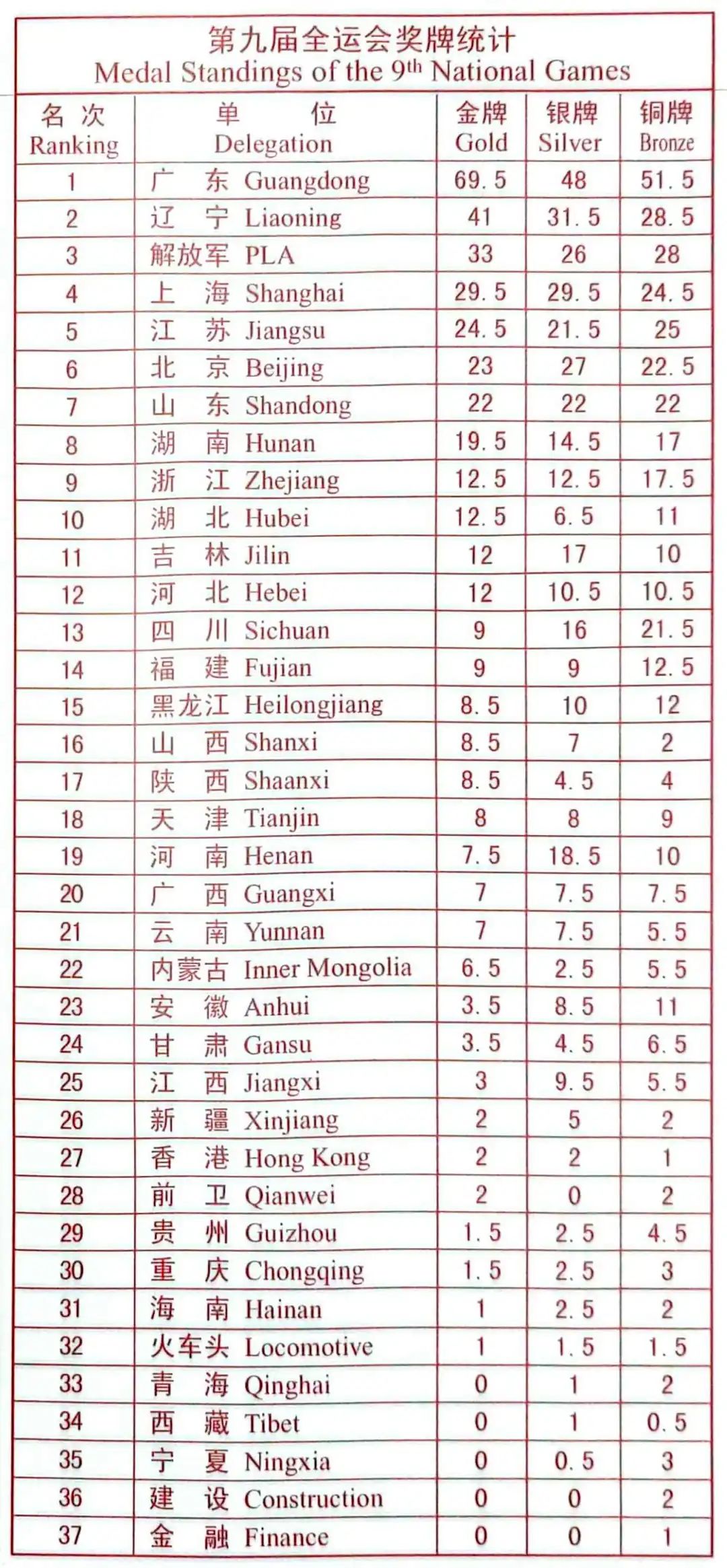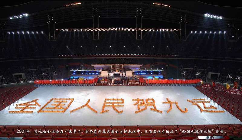 中华人民共和国第9届运动会于2001年11月11日至25日在广州举行。九运会是进入新世纪我国举办的第一次全国综合性体育盛会。运动会共有45个代表团的12314名运动员参加了预赛,8608名运动员参加了决赛。澳门特别行政区首次组团参加本届运动会。各路运动健儿经过全力拼搏,创造了一批好成绩,在30个大项345个小项中共决出411.5枚金牌、398枚银牌、405枚铜牌。在参赛的45个代表团中,32个获得金牌,37个获得奖牌。