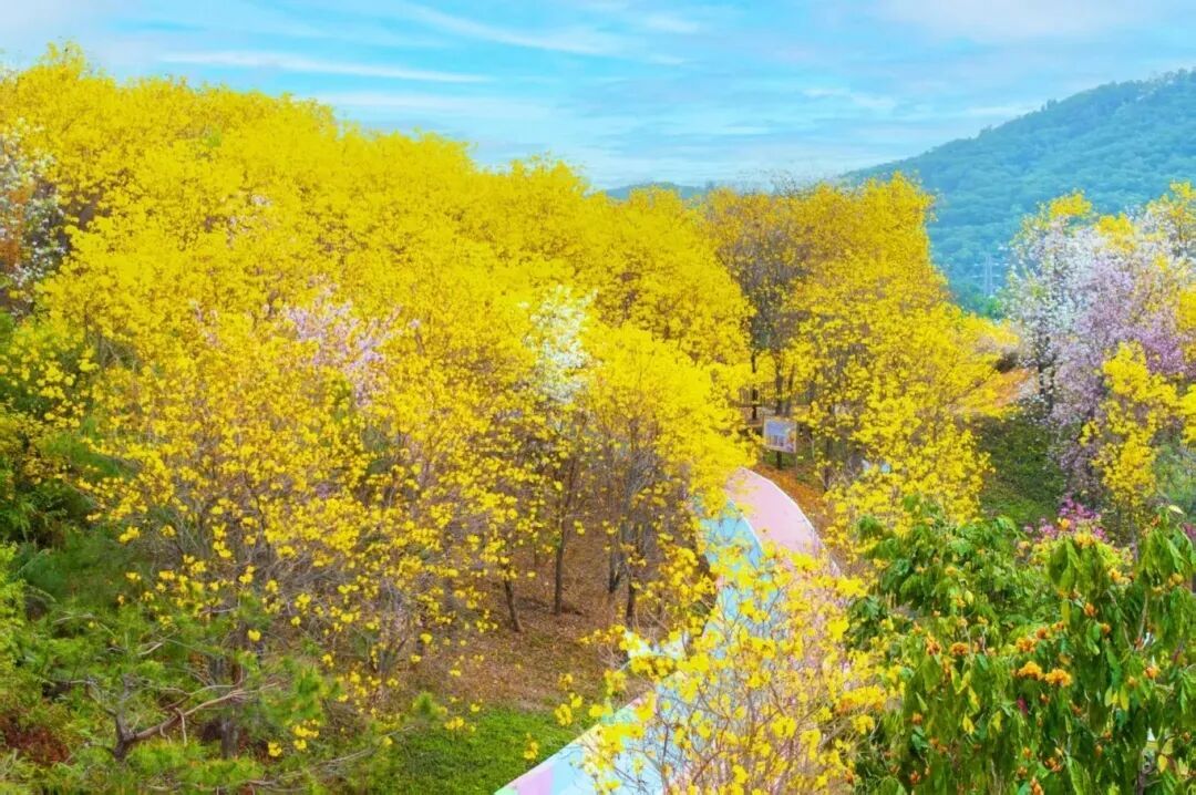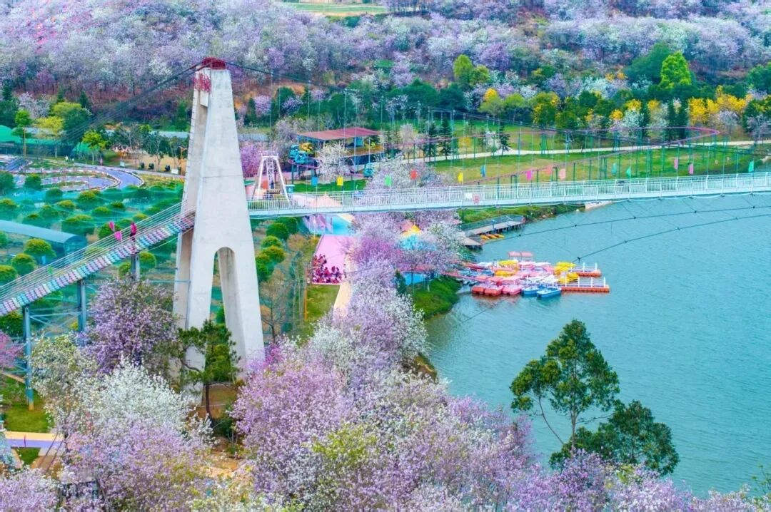 作为广东最大的宫粉紫荆花种植基地,1100亩粉紫花海并非简单的色块堆砌,而是一幅精心设计的大地艺术。春季,宫粉紫荆与黄花风铃木、油菜花、木棉花次第绽放,形成层次丰富的色彩交响;夏季,浓荫蔽日,溪水潺潺;秋季,稻浪翻滚,果香四溢;冬季,疏林寒水,意境悠远。