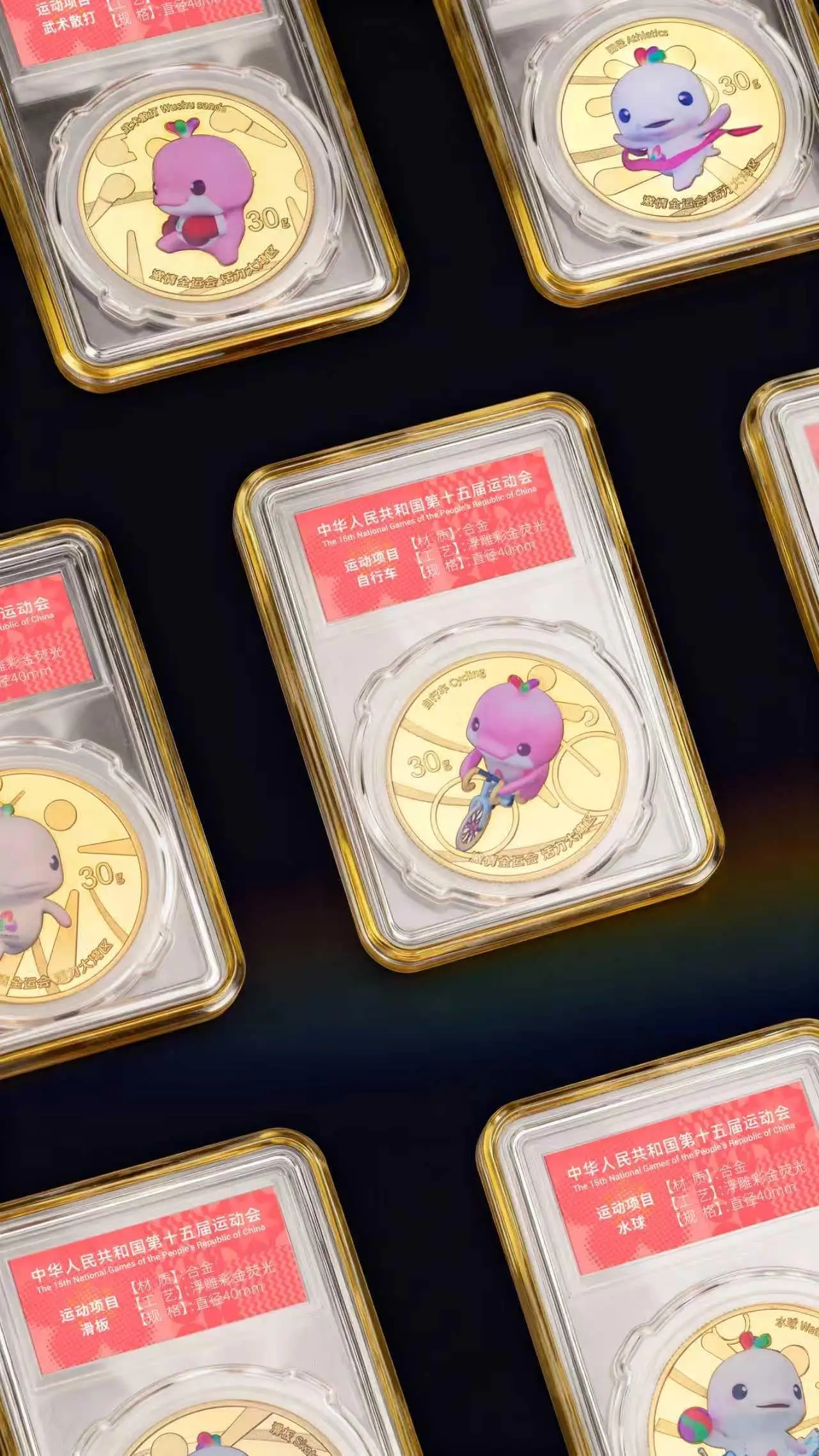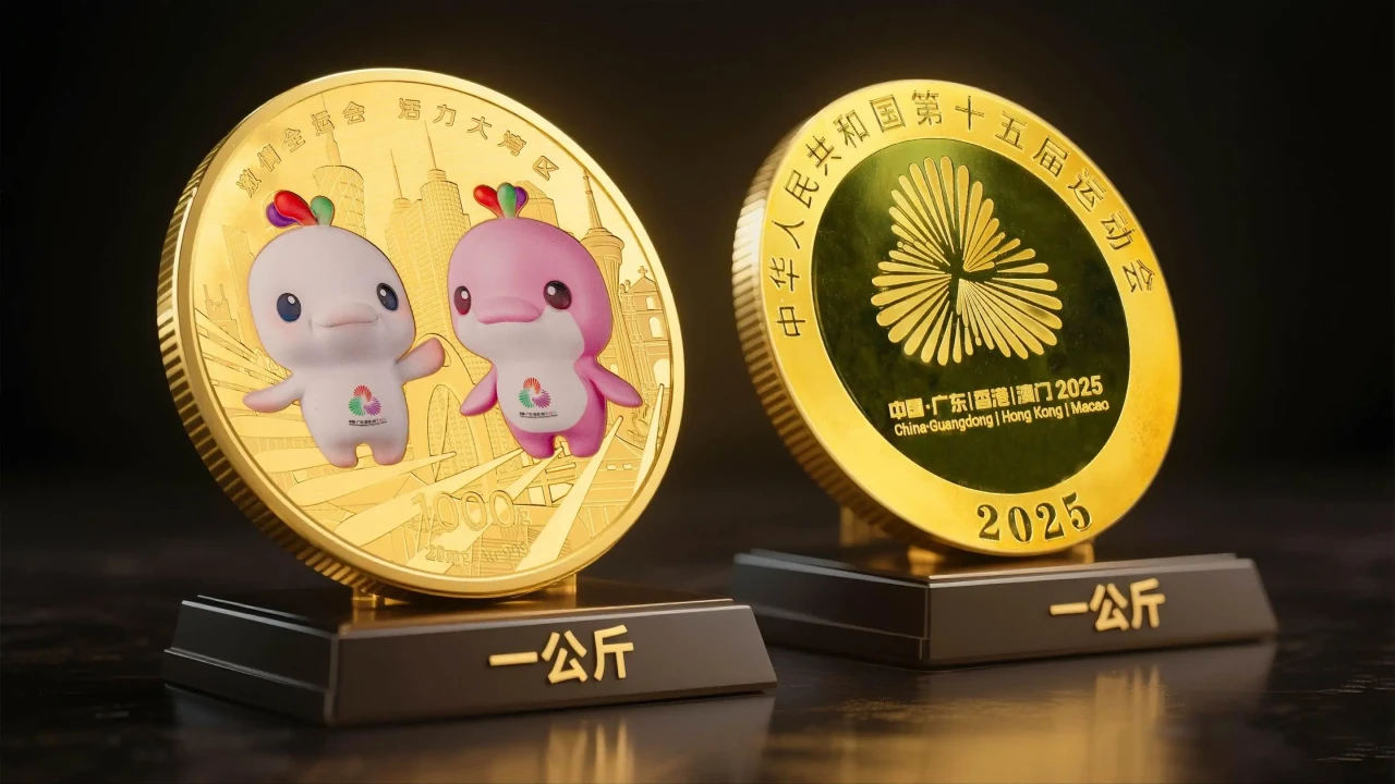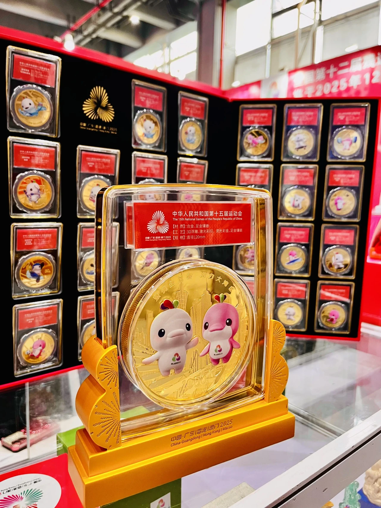 纪念金工艺摆件则采用1公斤大规格纪念章设计,寓意团圆和美的“喜洋洋”与“乐融融”在“同心礼花”背景映衬下活灵活现、栩栩如生,彰显着第十五届全运会的神韵与风采。