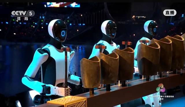 此刻,钟声响起,岭南名曲《彩云追月》旋律在寂静的体育场内回响。而与寻常演奏不同,奏响这开篇首串音符的,竟是工业人形机器人,它们手持钟槌,敲击的正是两千多年前的青铜“句鑃”(gōu diào)。