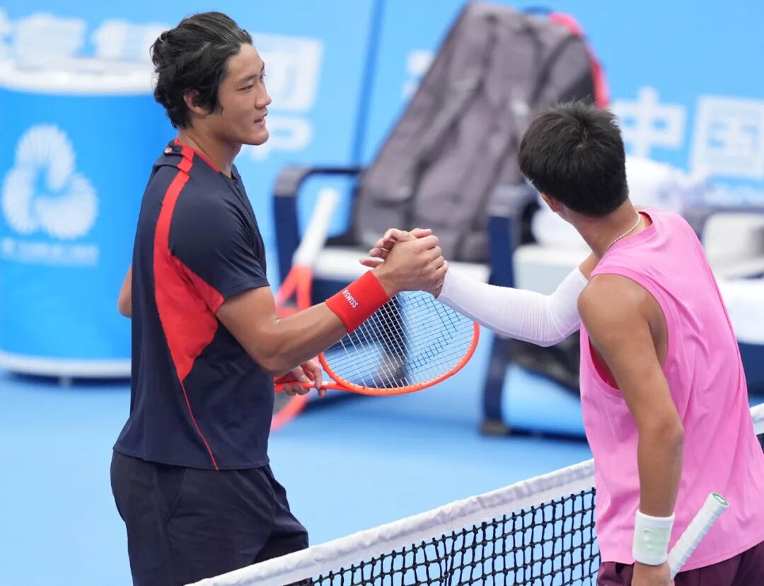 11月13日,第十五届全国运动会网球项目男子单打第一轮在珠海横琴举行。上海队选手张之臻(左)与湖南队选手周洺舟在赛后握手致意。