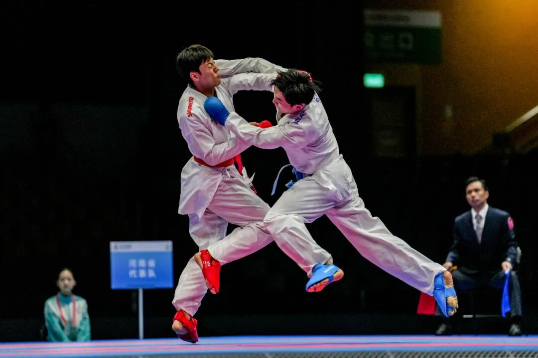 11月7日,第十五届全国运动会群众比赛空手道男子个人75公斤级决赛在澳门举行。最终,山东队邢辉(右)9比1击败河南队张一鸣,获得金牌。
