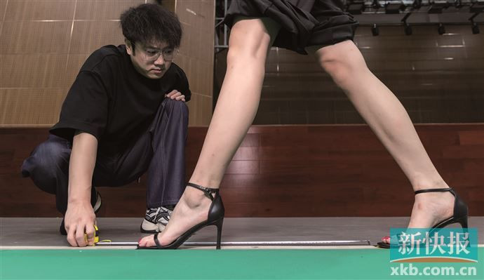 在训练中,教练会用尺子对引导员的步幅进行准确定位,脚尖张开的标准是15cm。