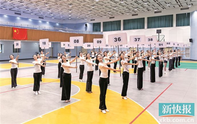 傍晚时分,广州民航职业技术学院体育馆内灯火如昼。40余名来自华南农业大学与广州民航职业技术学院的女孩正投入紧张集训,这群平均年龄仅18岁的少女,肩负着十五运会开幕式代表团引导员的重任——她们将是11月9日开幕式上绽放青春风采的“举牌小姐姐”。
