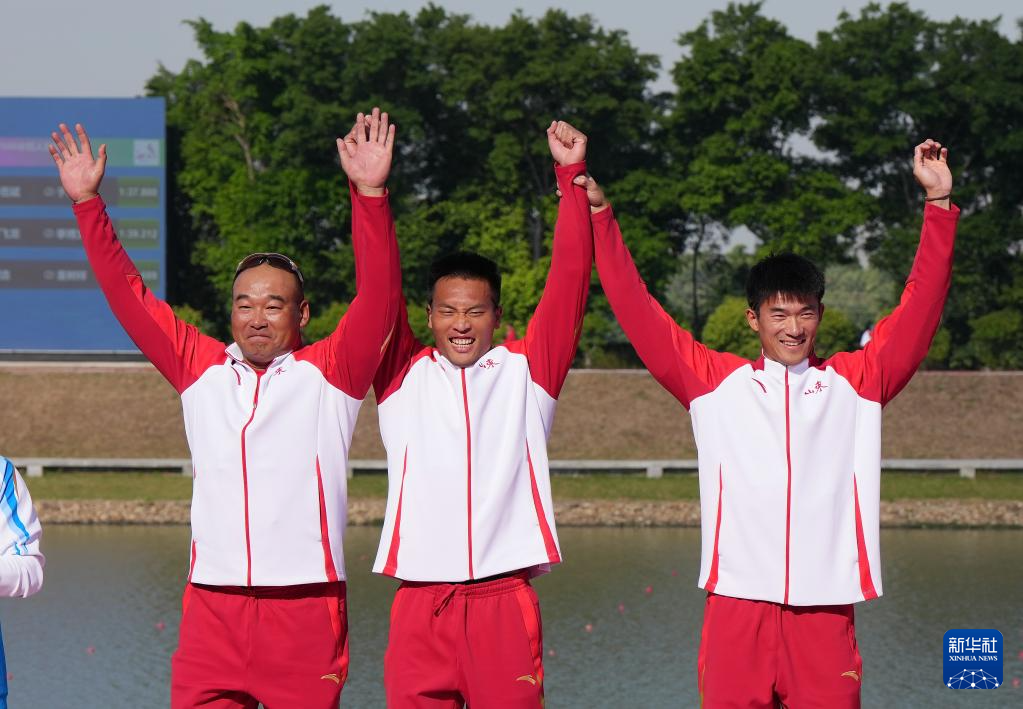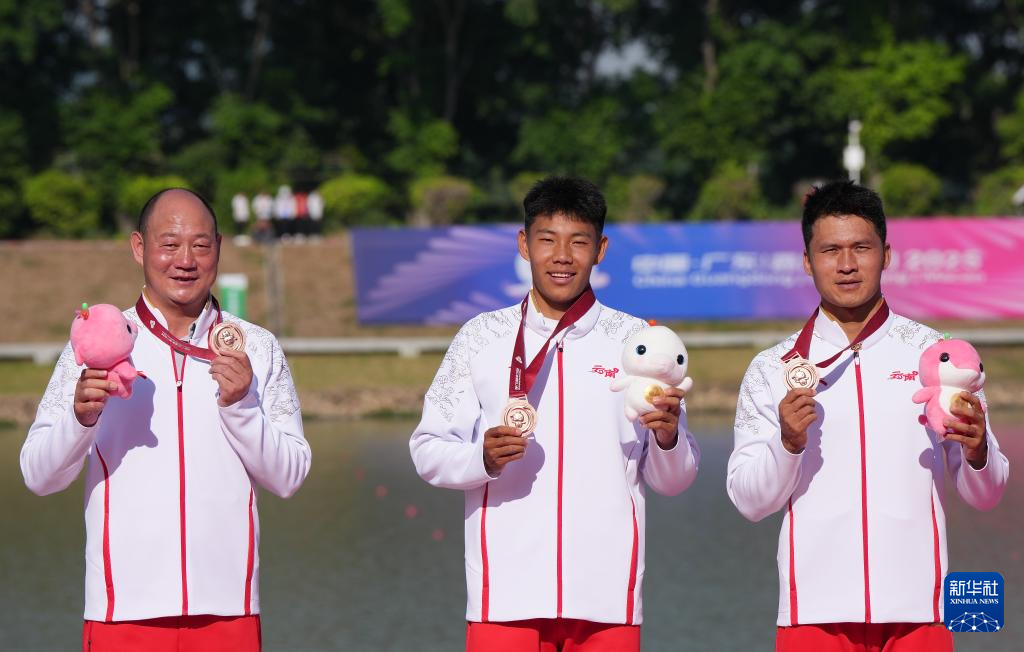 11月17日,冠军山东队选手于岳斌(右)/于陈伟(中)和教练员在颁奖仪式上。新华社记者 晋美多吉 摄