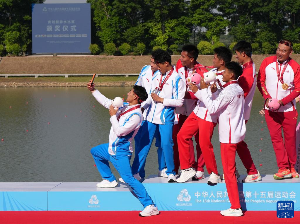 11月17日,获奖运动员和教练员在颁奖仪式上自拍。新华社记者 晋美多吉 摄