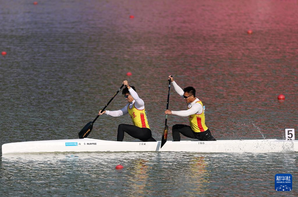 11月17日,山东队选手于岳斌(左)/于陈伟在男子500米双人划艇决赛A中。最终,他们夺得冠军。新华社记者 晋美多吉 摄