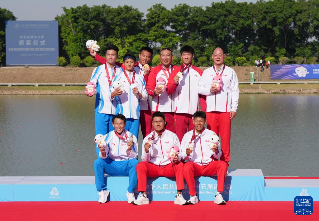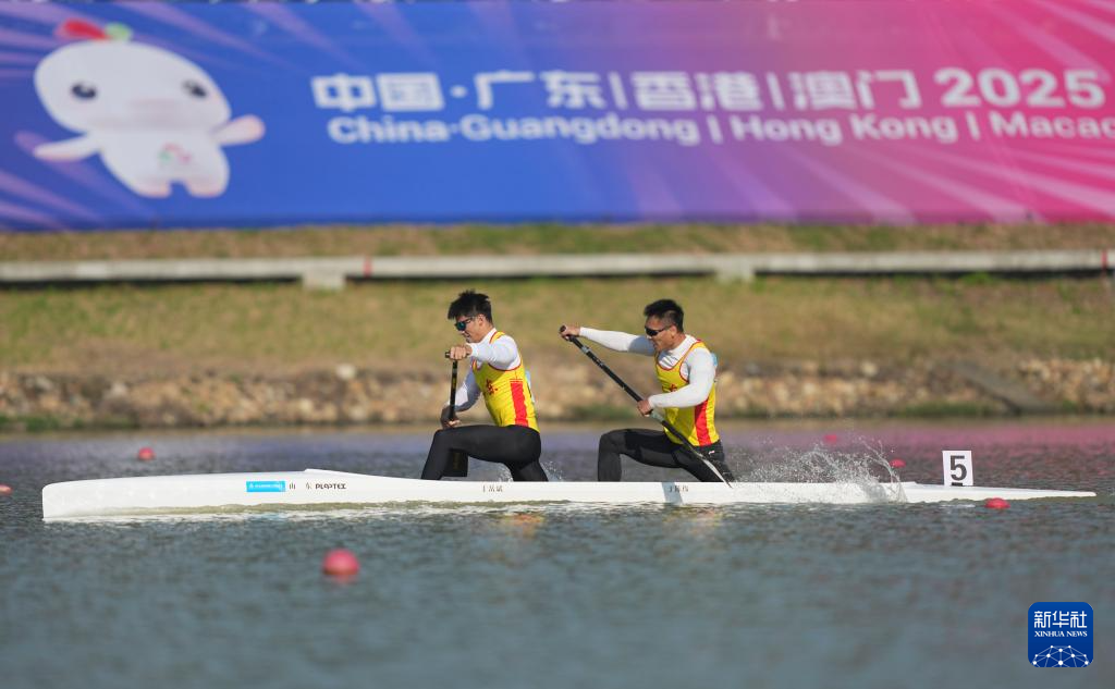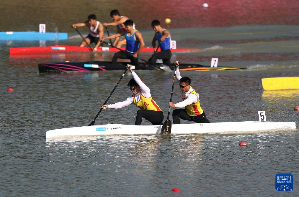 11月17日,第十五届全国运动会皮划艇静水项目男子500米双人划艇决赛在广州举行。