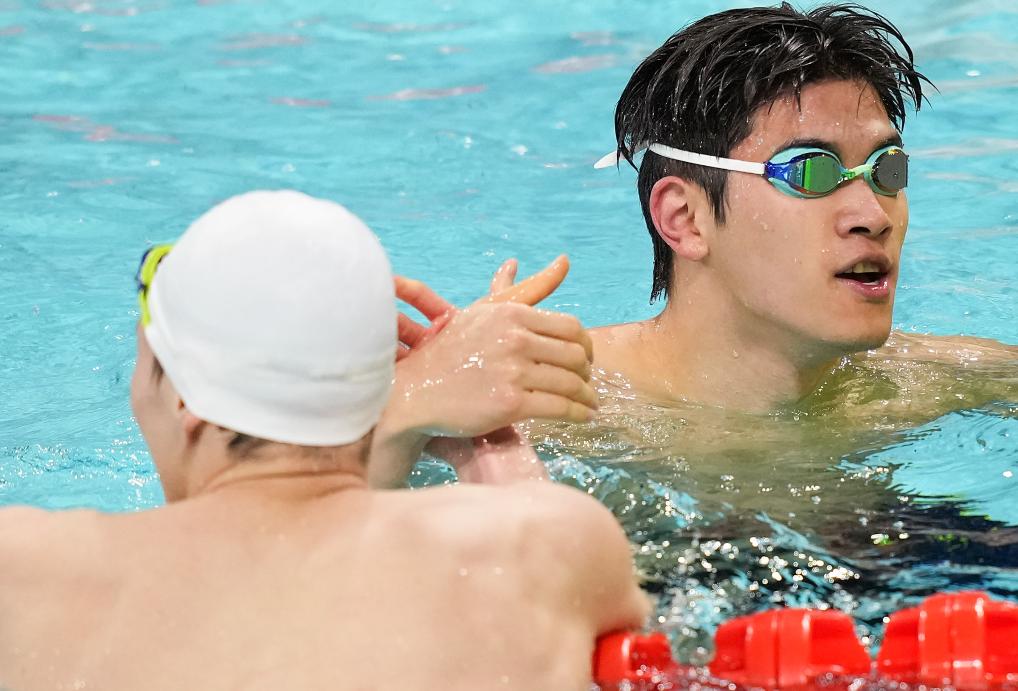 11月14日,浙江队选手潘展乐(右)与江苏队选手赵家悦在赛后握手致意。夏一方 摄