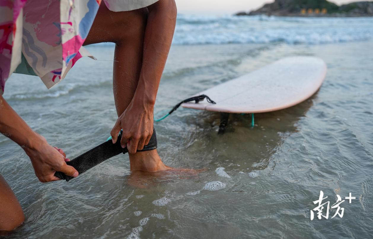 一位冲浪者在冲浪前绑好脚绳,做好安全准备。