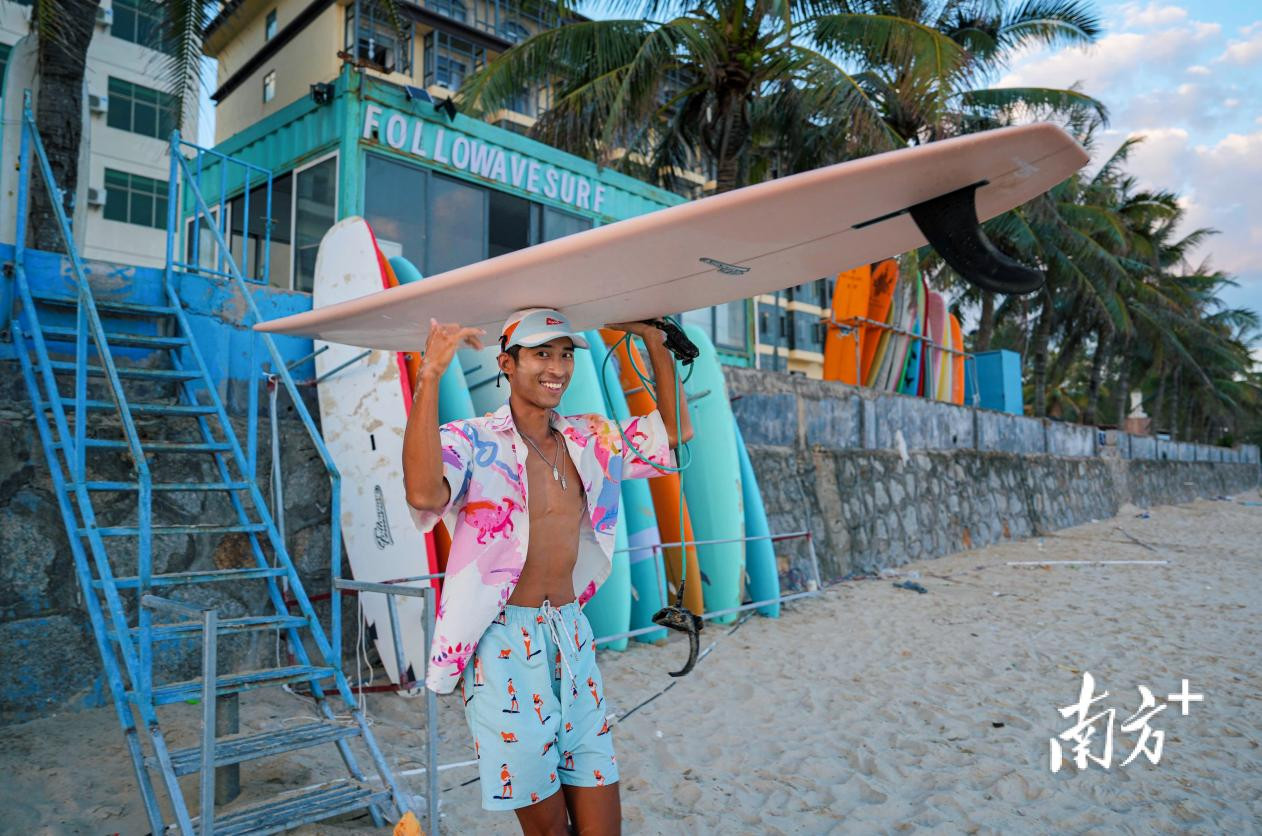 2019年,他回到家乡红海湾,结合了咖啡和冲浪等元素,开了一家名为落日冲浪的店铺。随着冲浪运动逐渐被更多人喜爱,加上家乡文旅的发展,他的事业也越做越好,接待了许多大湾区的“浪人”。