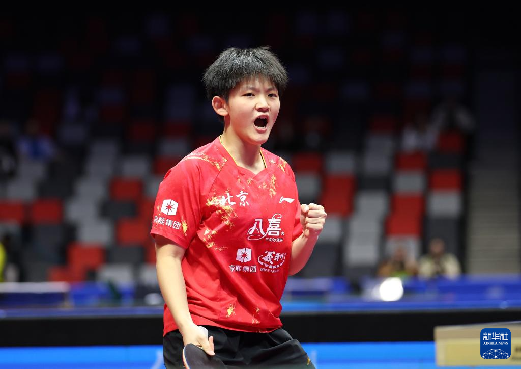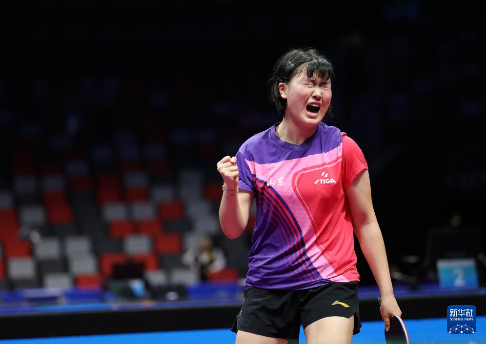 11月13日,山东队选手姜依依在比赛后庆祝。她在单打比赛中3比0战胜北京队选手刘昕冉。