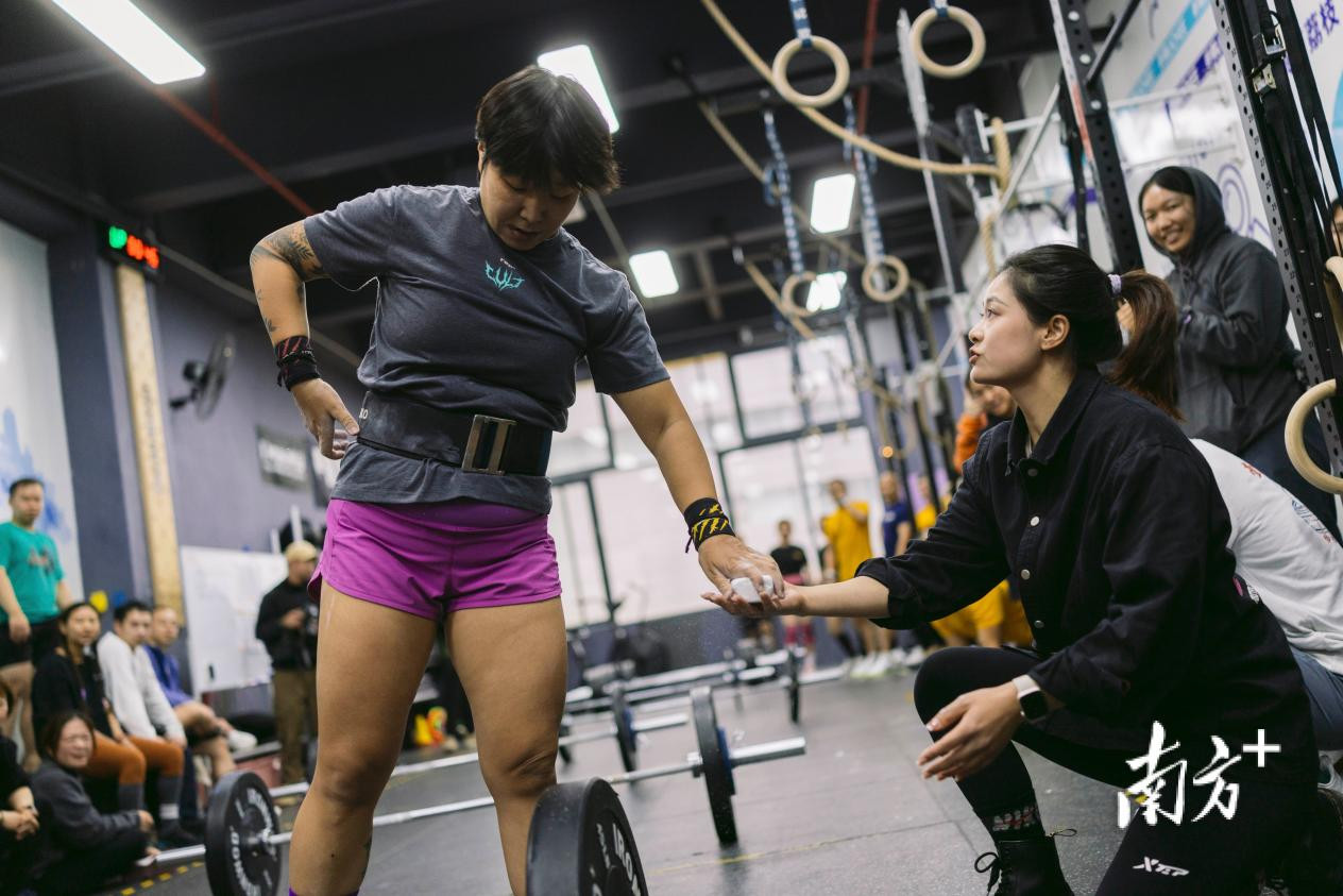 举重爱好者菜菜(右)为队友牛牛递上镁粉块,并叮嘱其下一把举起冲重量时应该注意的事项。