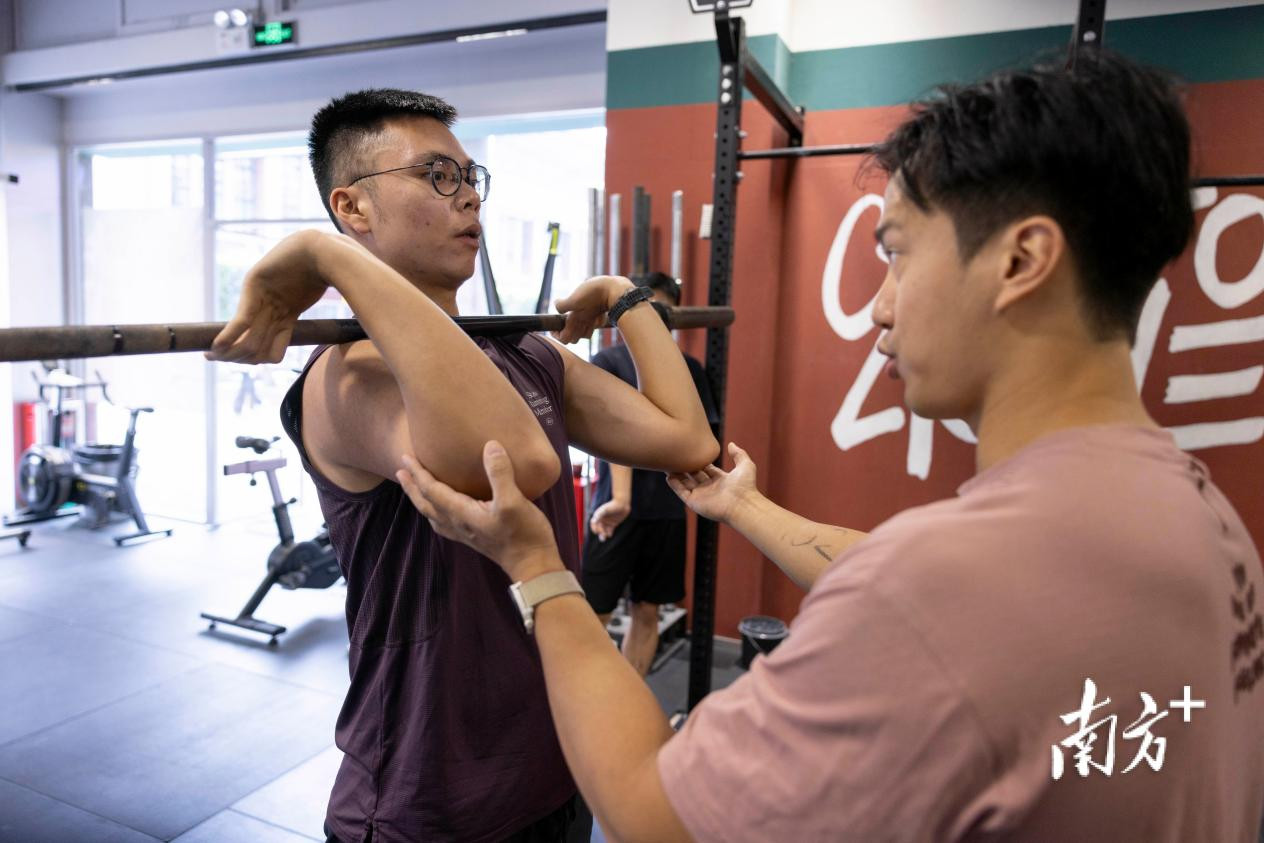 举重课程中,朱广元正在慢慢调整学员的向上翻肘幅度。