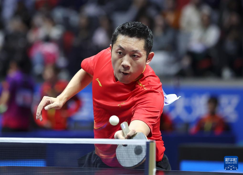 11月14日,上海队选手许昕在比赛中回球。他在单打比赛中3比1战胜江苏队选手陈亚轩。