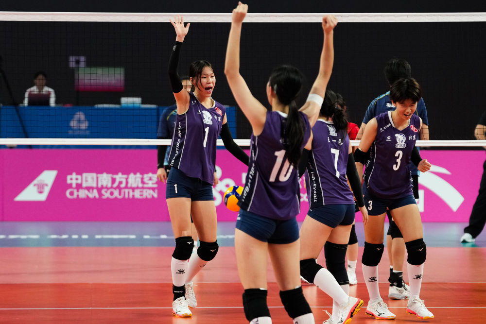 11月17日,北京队球员王程儒(左一)与队友在排球女子18岁以下组小组赛比赛中庆祝得分。新华社记者 陈思汗 摄