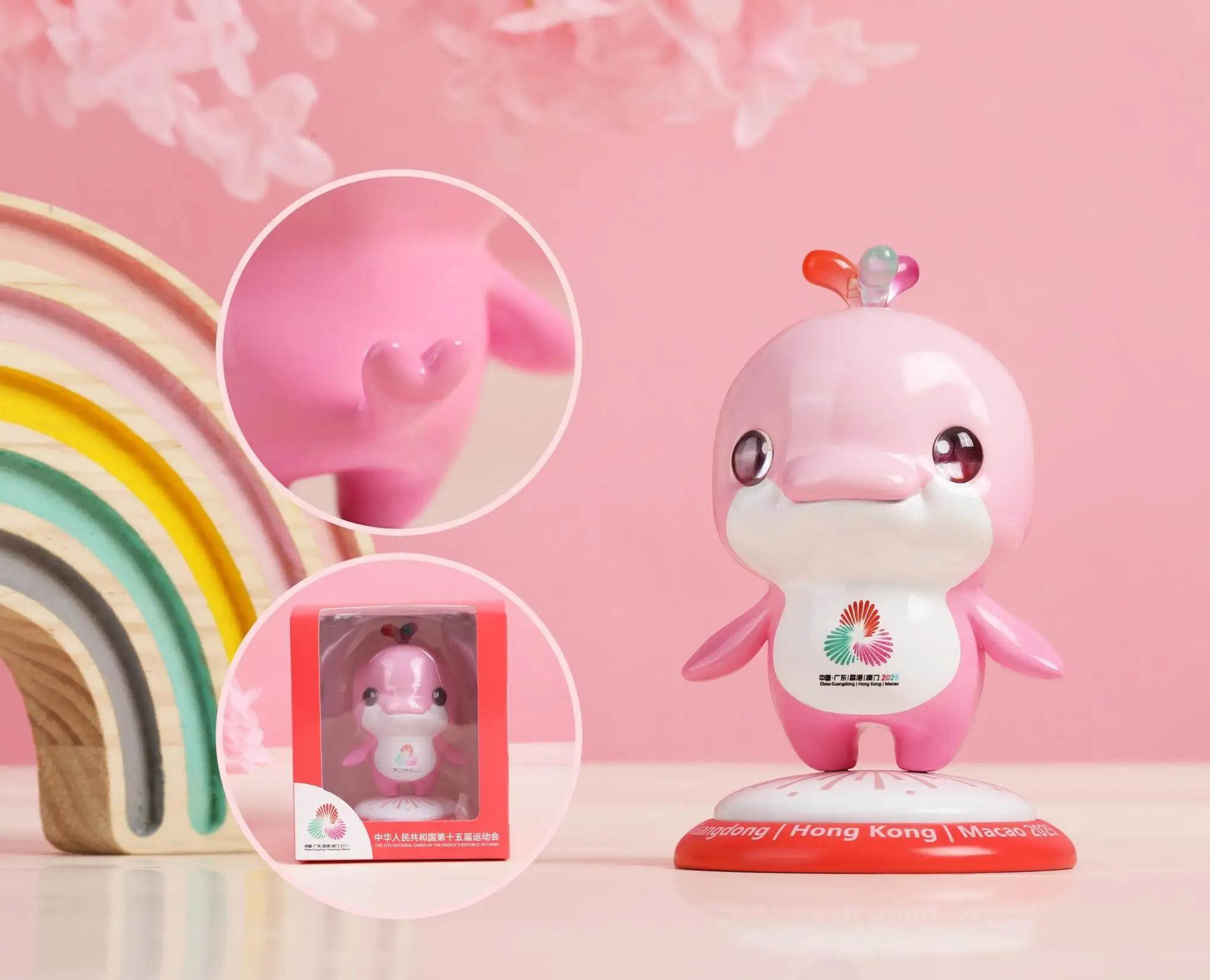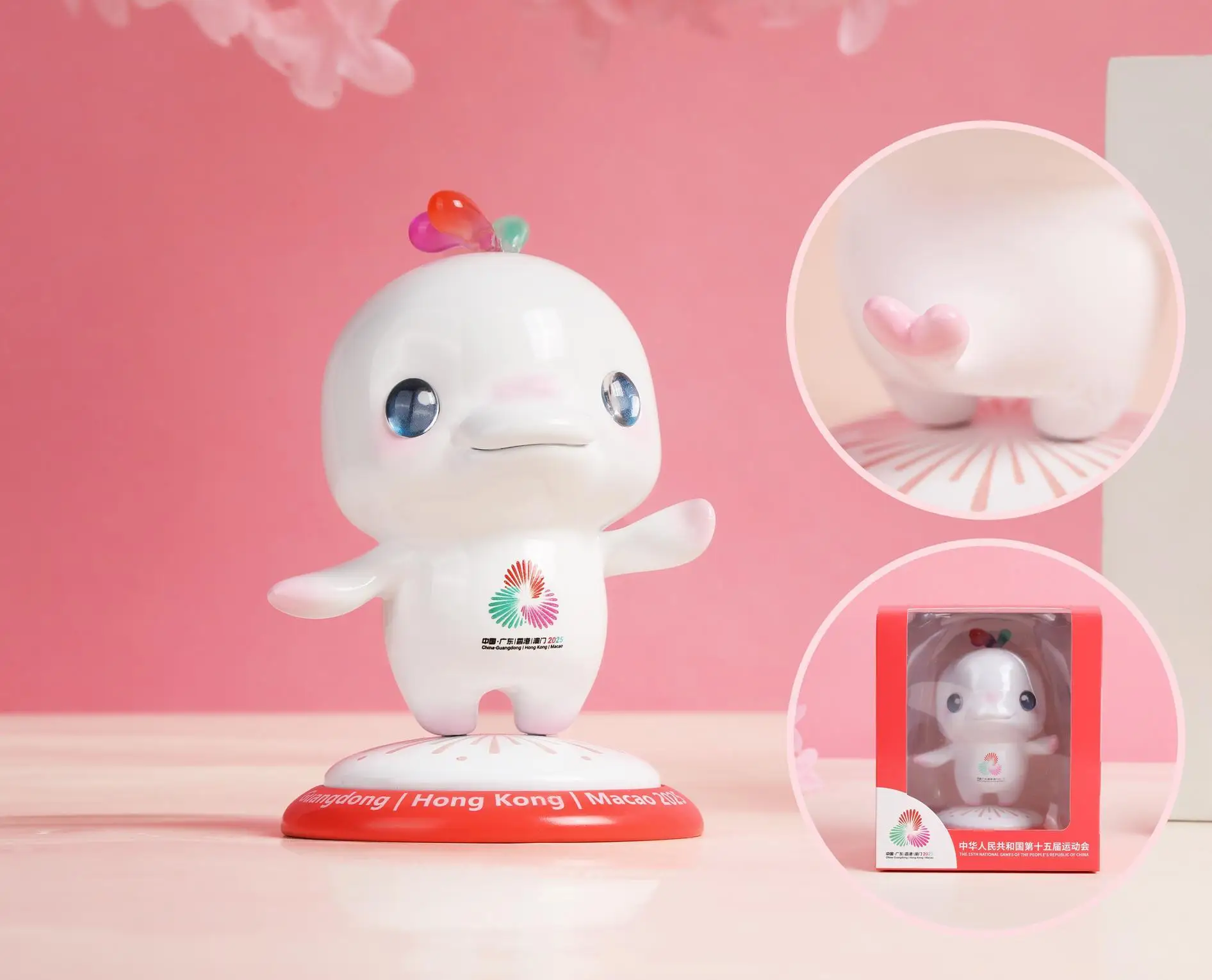 吉祥物“喜洋洋”“乐融融”以国家一级保护动物中华白海豚为原型,一白一粉,圆润可爱,它们的名字更藏着“喜气洋洋、其乐融融”的美好寓意。在运动系列造型中,它们联袂出镜,将竞技瞬间定格,动态形象尽显力量、速度与技术,灵动身形搭配运动项目,既强化了赛事辨识度,更生动展现了运动健儿活力四射、奋力拼搏的模样。