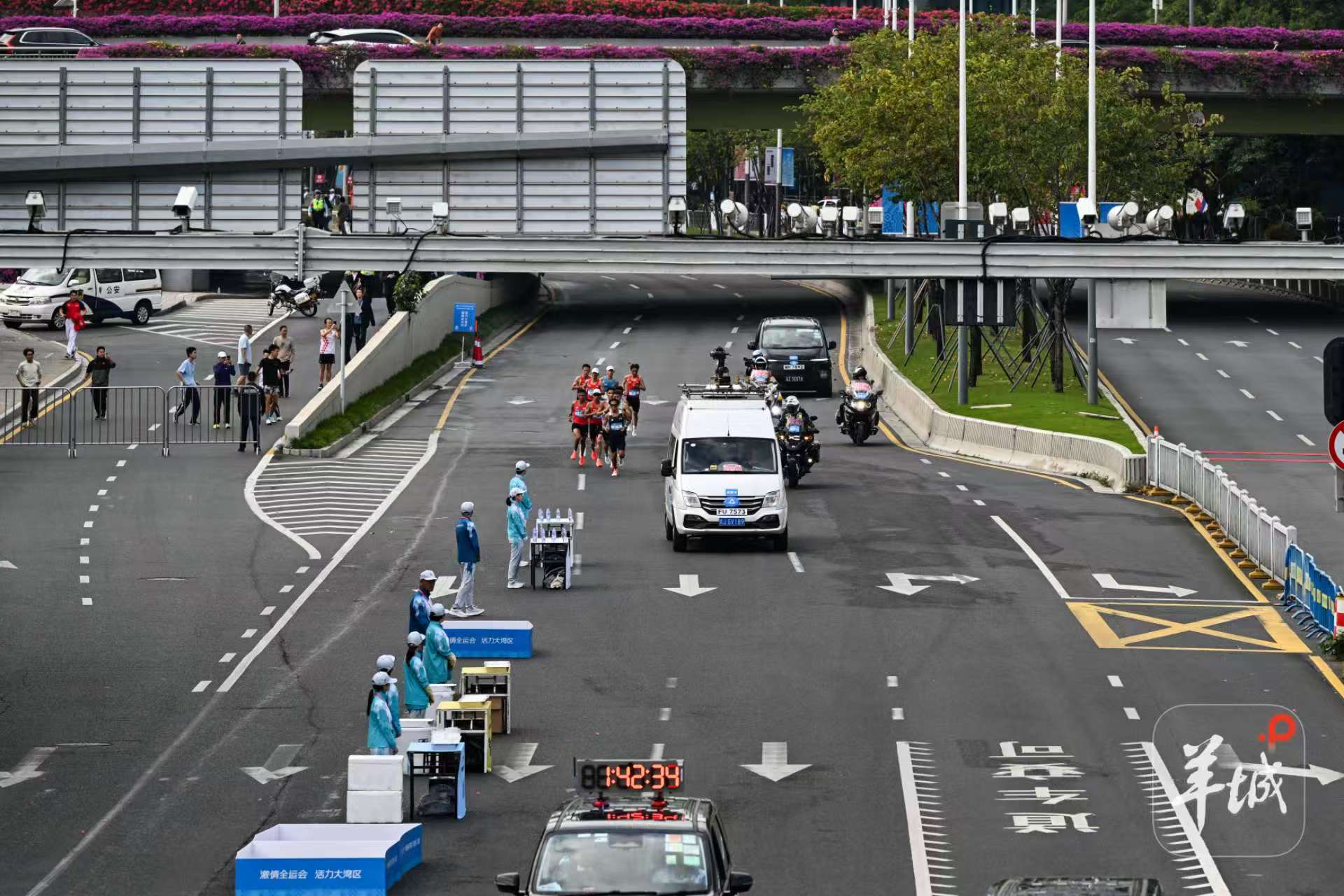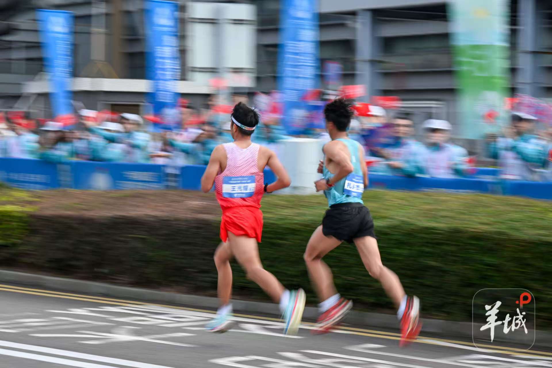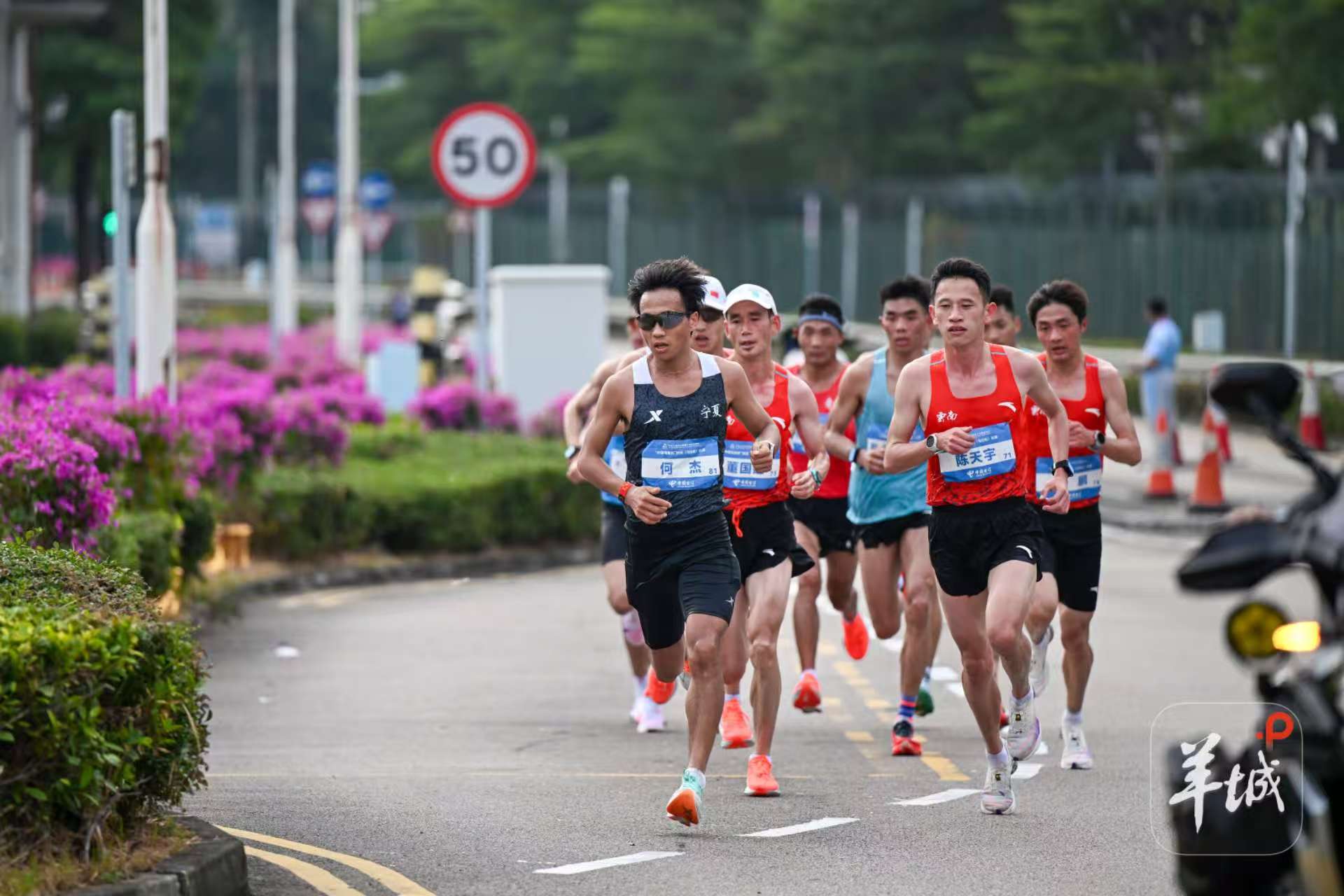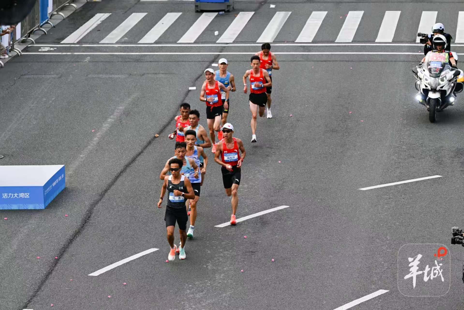 男子马拉松第一梯队已进入最后10公里冲刺。羊城晚报记者 曾育文 摄