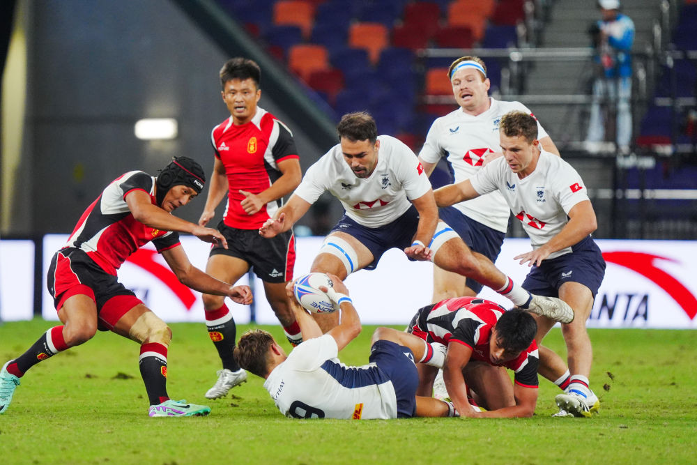 11月14日,双方球员在比赛中拼抢。当日,在香港举行的第十五届全国运动会七人制橄榄球男子金牌赛中,香港队26比19战胜山东队,夺得冠军。新华社记者 朱炜 摄