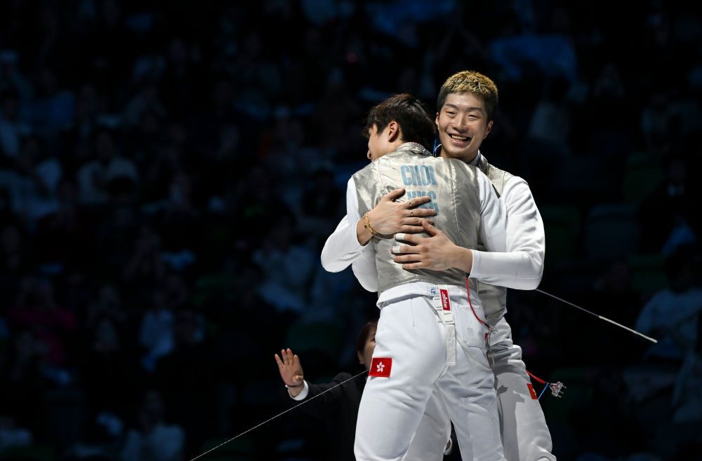 11月19日,香港队选手蔡俊彦(左)和队友张家朗在比赛后相拥庆祝夺冠。新华社记者 胡虎虎 摄