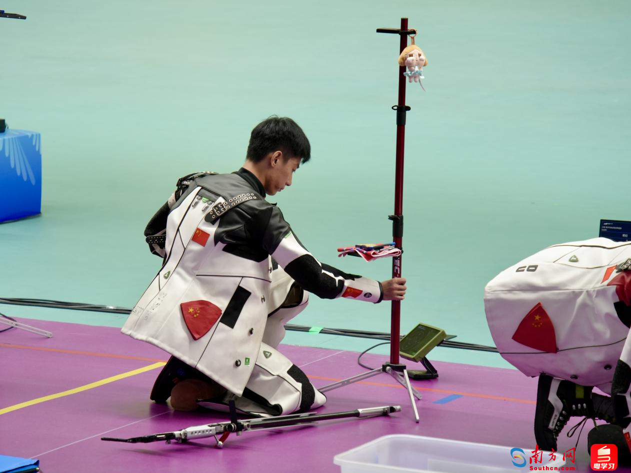 记者观察到,参赛选手绝大部分是“95后”,十分年轻。天津队选手赵文宇的枪架上还挂着可爱的玩偶。
