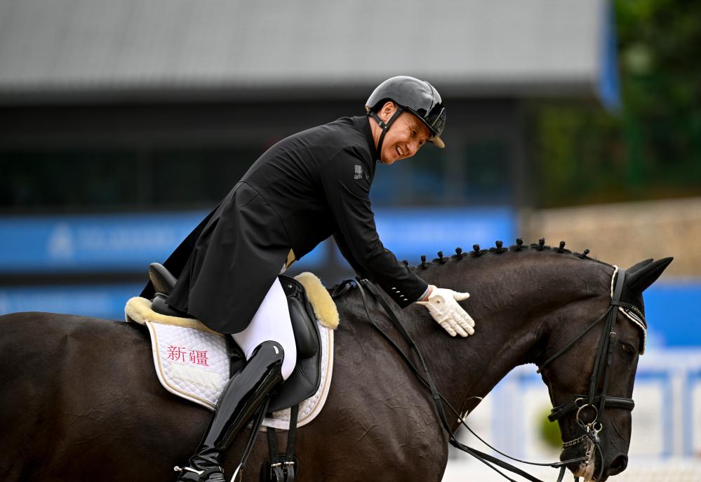 11月12日,新疆队选手刘涛在比赛后轻拍马匹“KNOXVILLE TT”。最终他获得冠军。冯开华 摄