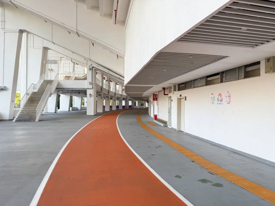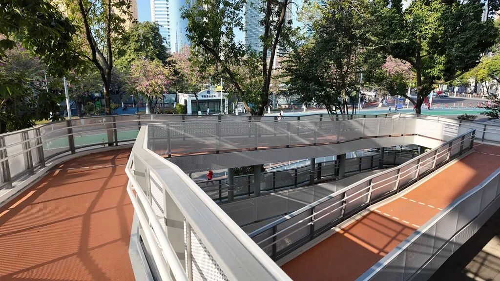 在天河体育中心体育场北门,二层平台增设了长达700米的环形跑道,还加设了电梯和直达二层平台的无障碍通道,这大大方便了残障人士参加体育运动,同时也为晨练的市民提供了一条全天候健身步道。