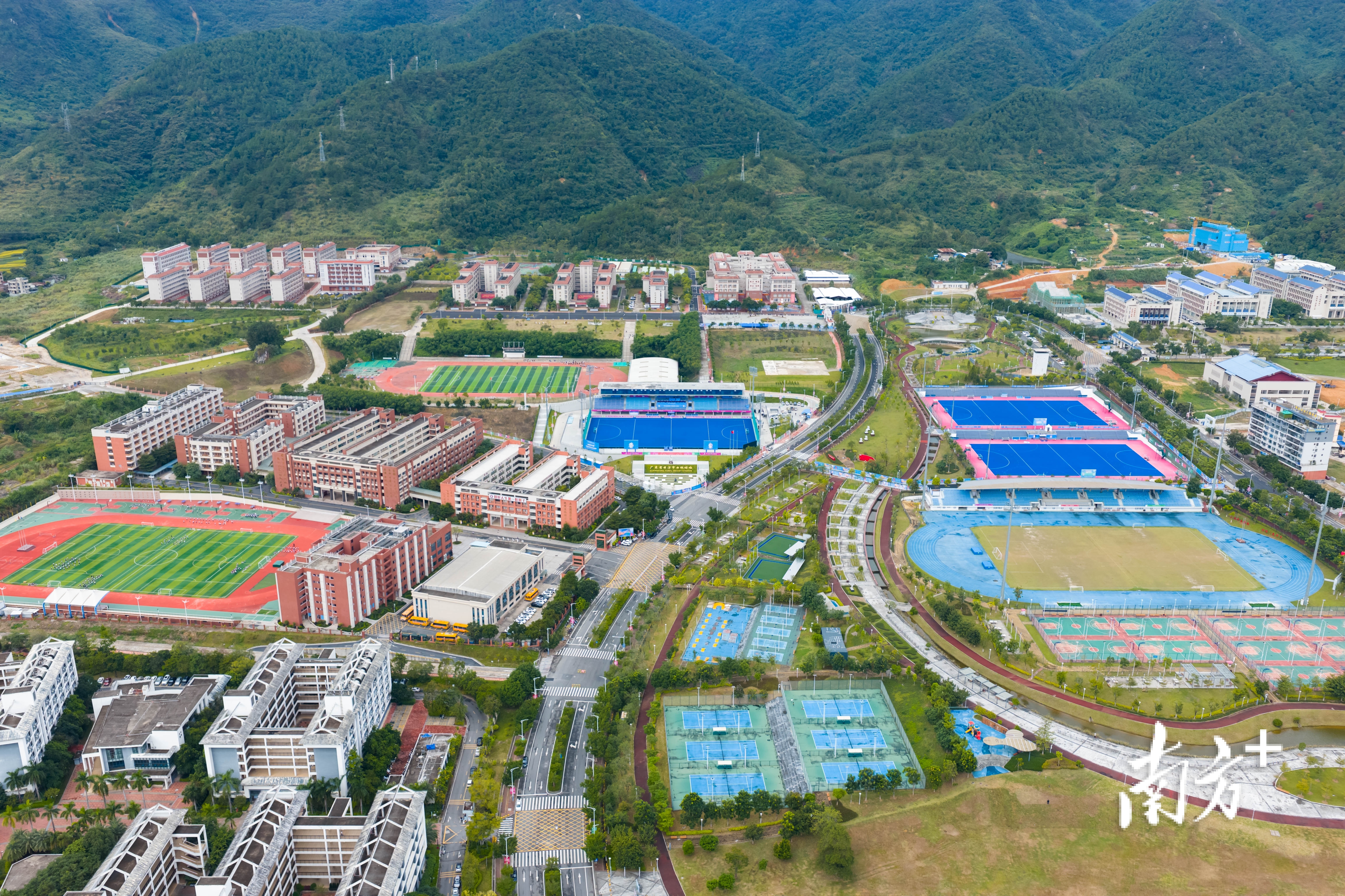 云浮市体育公园及其周边运动场众多,三片醒目的蓝色球场就是云浮三个国际级曲棍球场。