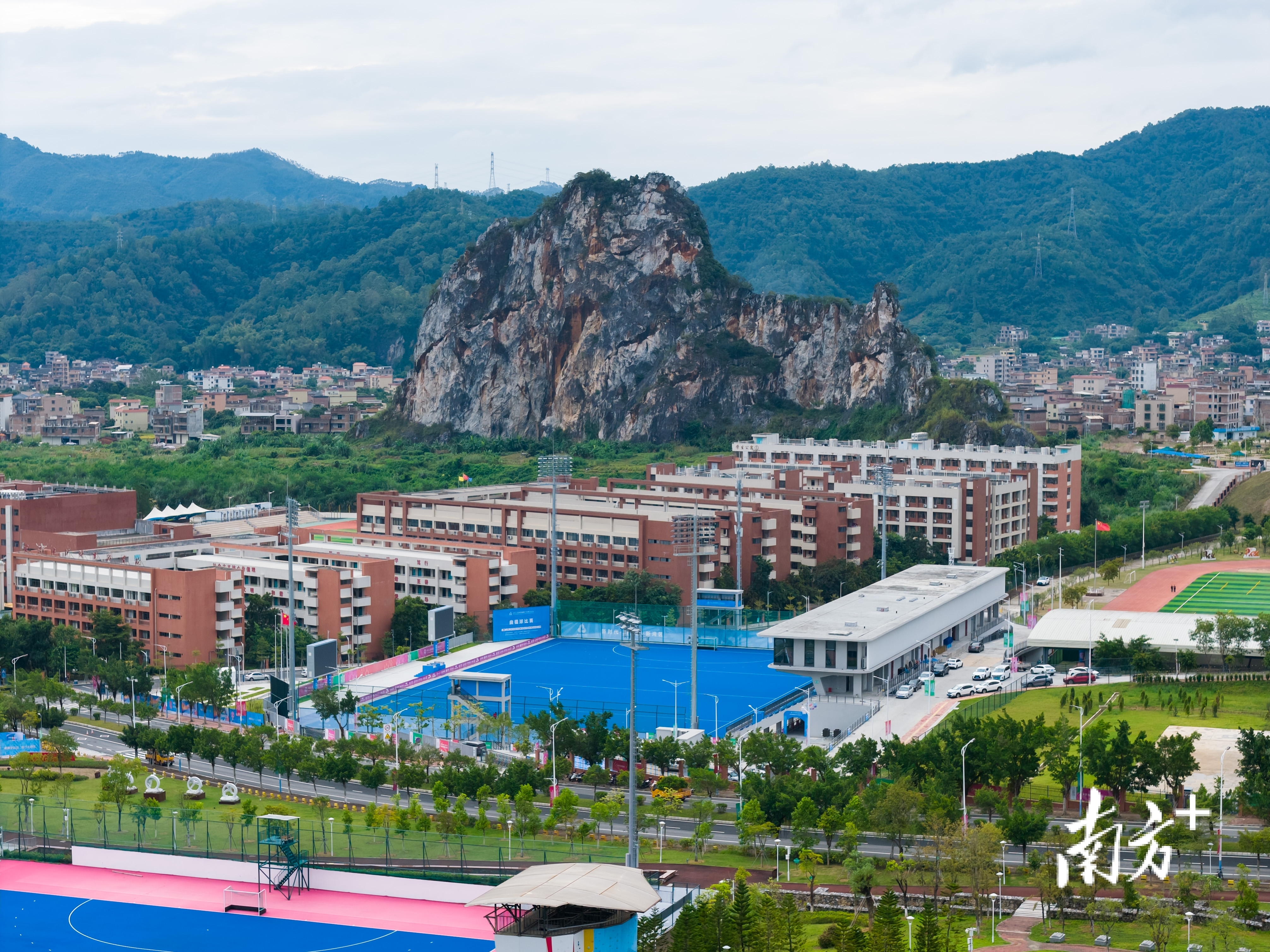云浮市被誉为“石城”,曲棍球场与远处的石山相互辉映。