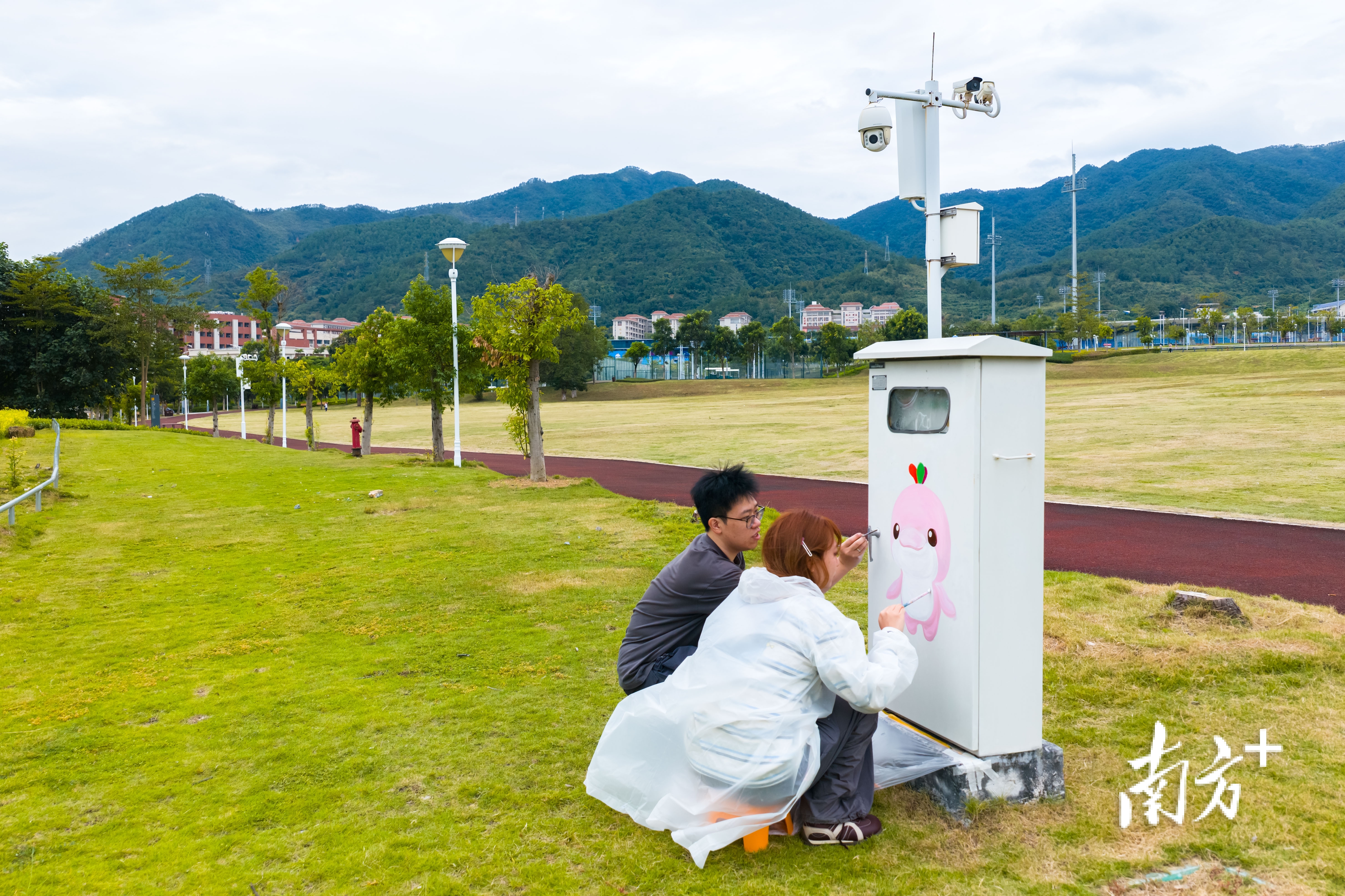 画师正在给云浮市体育公园内配电箱画上十五运会吉祥物“乐融融”。