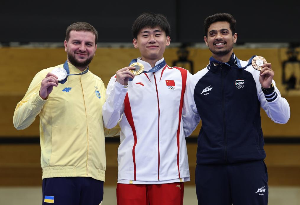 2024年8月1日,冠军中国选手刘宇坤(中)、亚军乌克兰选手库利什(左)和季军印度选手库萨莱在颁奖仪式上。当日,在法国沙托鲁举行的巴黎奥运会射击男子50米步枪三姿决赛中,中国选手刘宇坤夺得冠军。张帆 摄