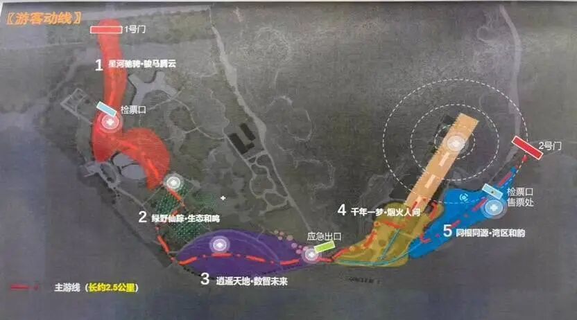 按照游客动线图,主游线长约2.5公里,整个灯会分为五大组团,分别是星河驰骋·骏马腾云、绿野仙踪·生态和鸣、逍遥天地·数智未来、千年一梦·烟火人间、同根同源·湾区和韵。