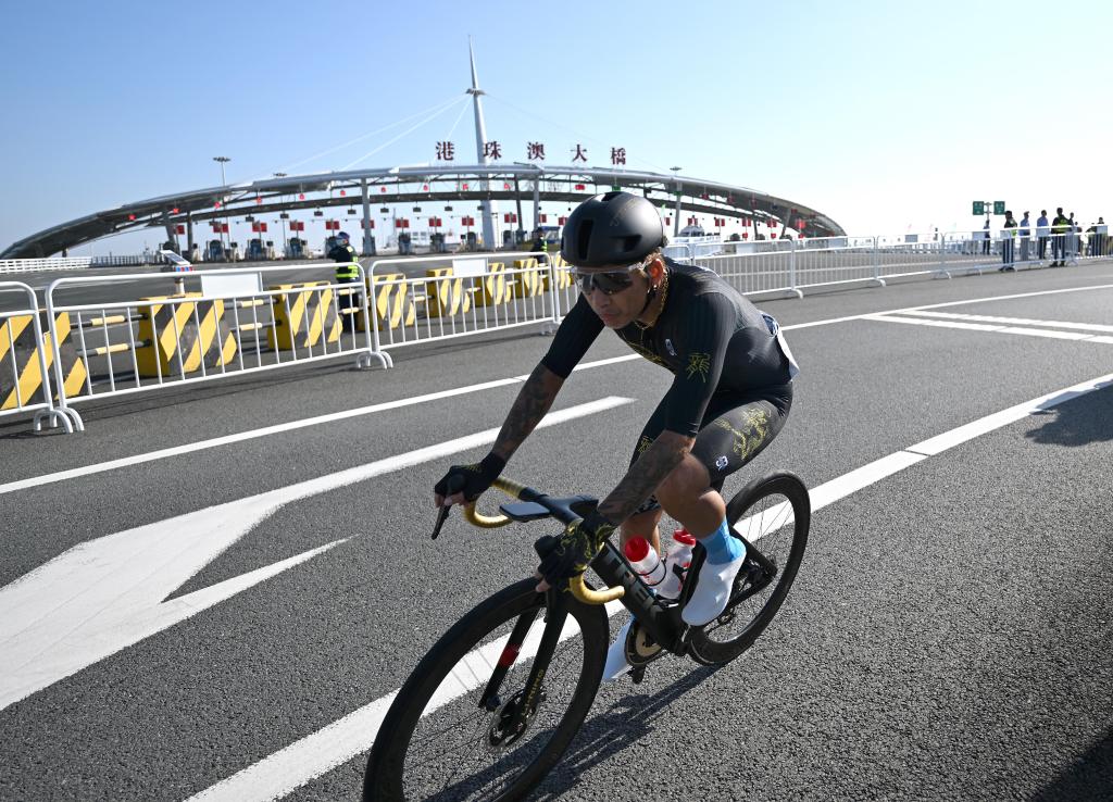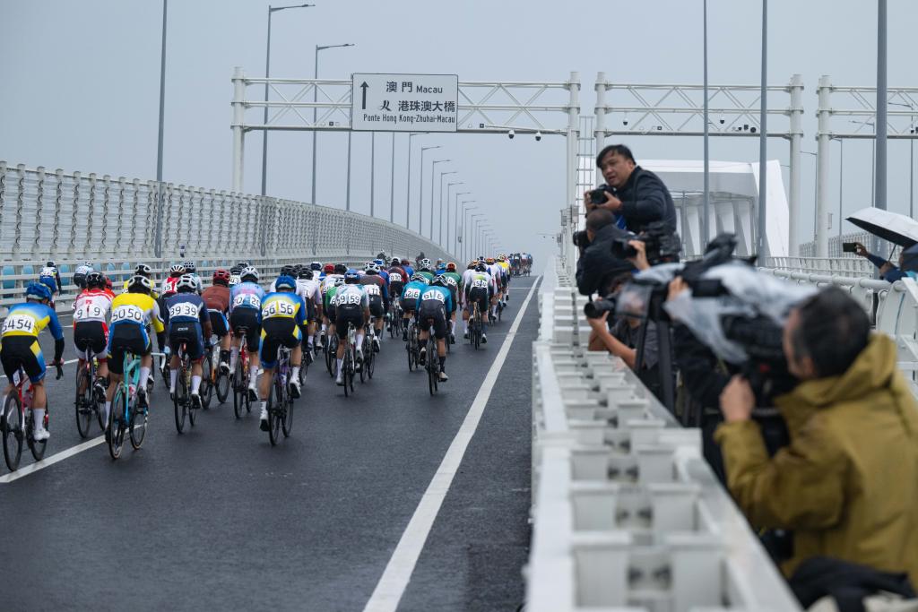 2024年11月24日,2024粤港澳公路自行车赛暨第十五届全国运动会公路自行车测试赛举行,图为参赛选手在澳门大桥骑行。张金加 摄