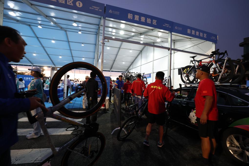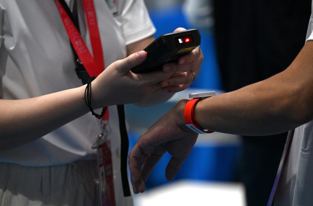 11月8日,志愿者为参赛选手佩戴通关手环。张晨霖 摄