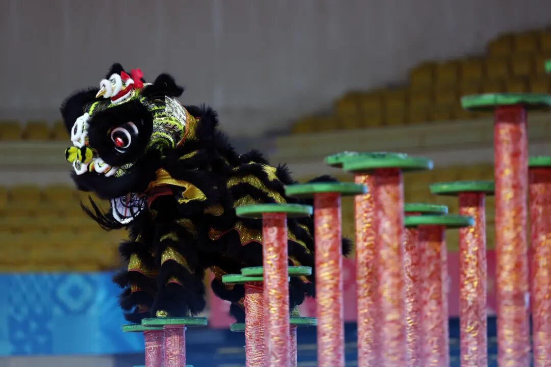 在广东,每逢喜事人们常请舞狮队来表演,以期聚喜气、讨彩头。舞龙舞狮作为群众展演项目首次亮相全运会舞台,作为承载着岭南文化的非遗传统项目,千年醒狮首登全运会就迅速走红。