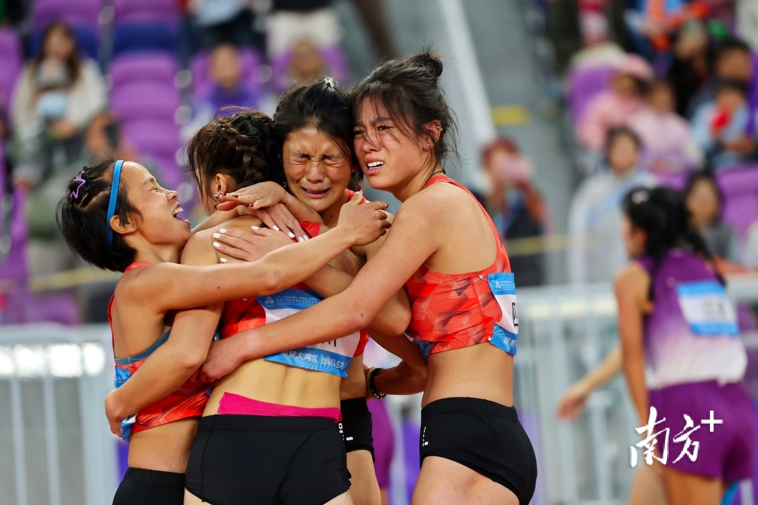 2025年12月14日,残特奥会田径项目女子4×400米接力听障决赛,四川队在最后一刻实现反超获得银牌,队员们拥抱落泪。郑新洽 摄