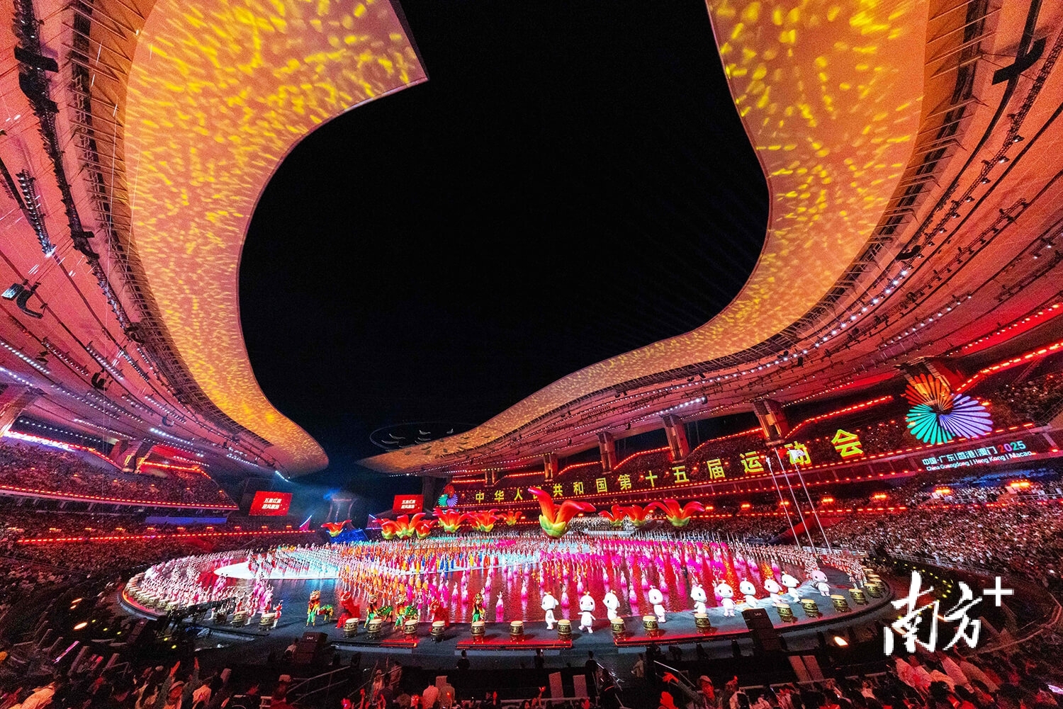 2025年11月9日,中华人民共和国第十五届运动会开幕式在广东奥林匹克体育中心举行。本届全运会是首次由粤港澳三地联合举办的全国性大型综合赛事,也是历史上规模最大、赛期最长、承办城市最多的一届全运会。苏韵桦 摄