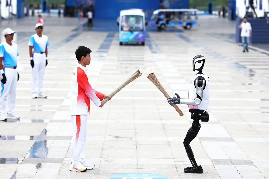 火炬手人形机器人“夸父”与王裕宁(左)在火炬传递中。图/新华社