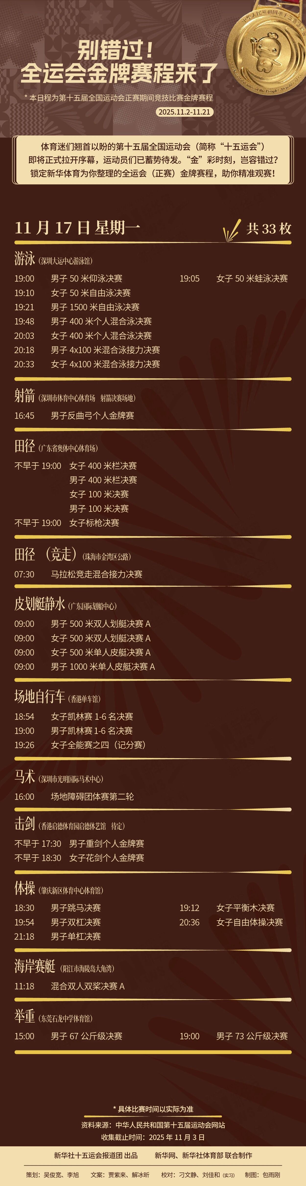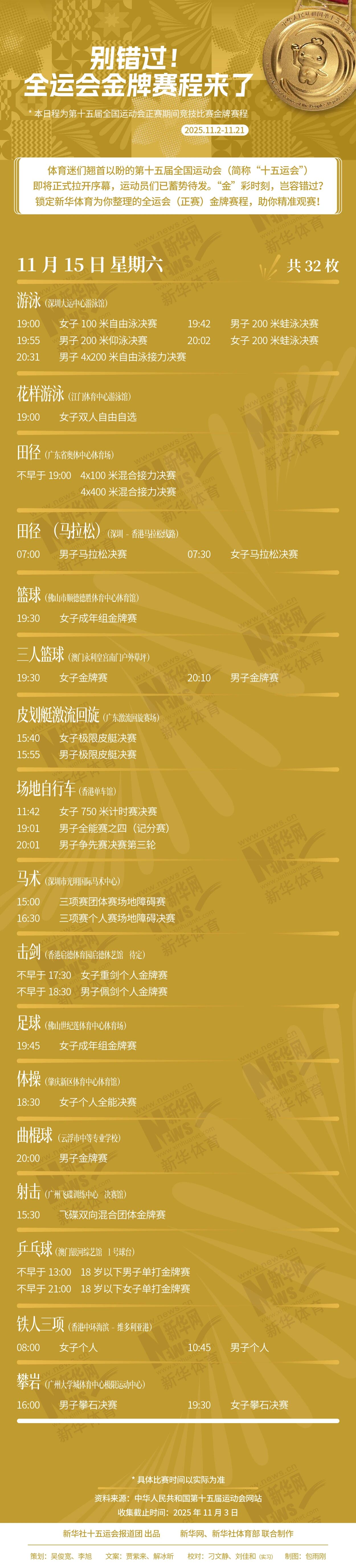 体育迷们翘首以盼的第十五届全国运动会(简称“十五运会”)即将正式拉开序幕,运动员们已蓄势待发。“金”彩时刻,不容错过!这份全运会(正赛)金牌赛程,助你精准观赛!