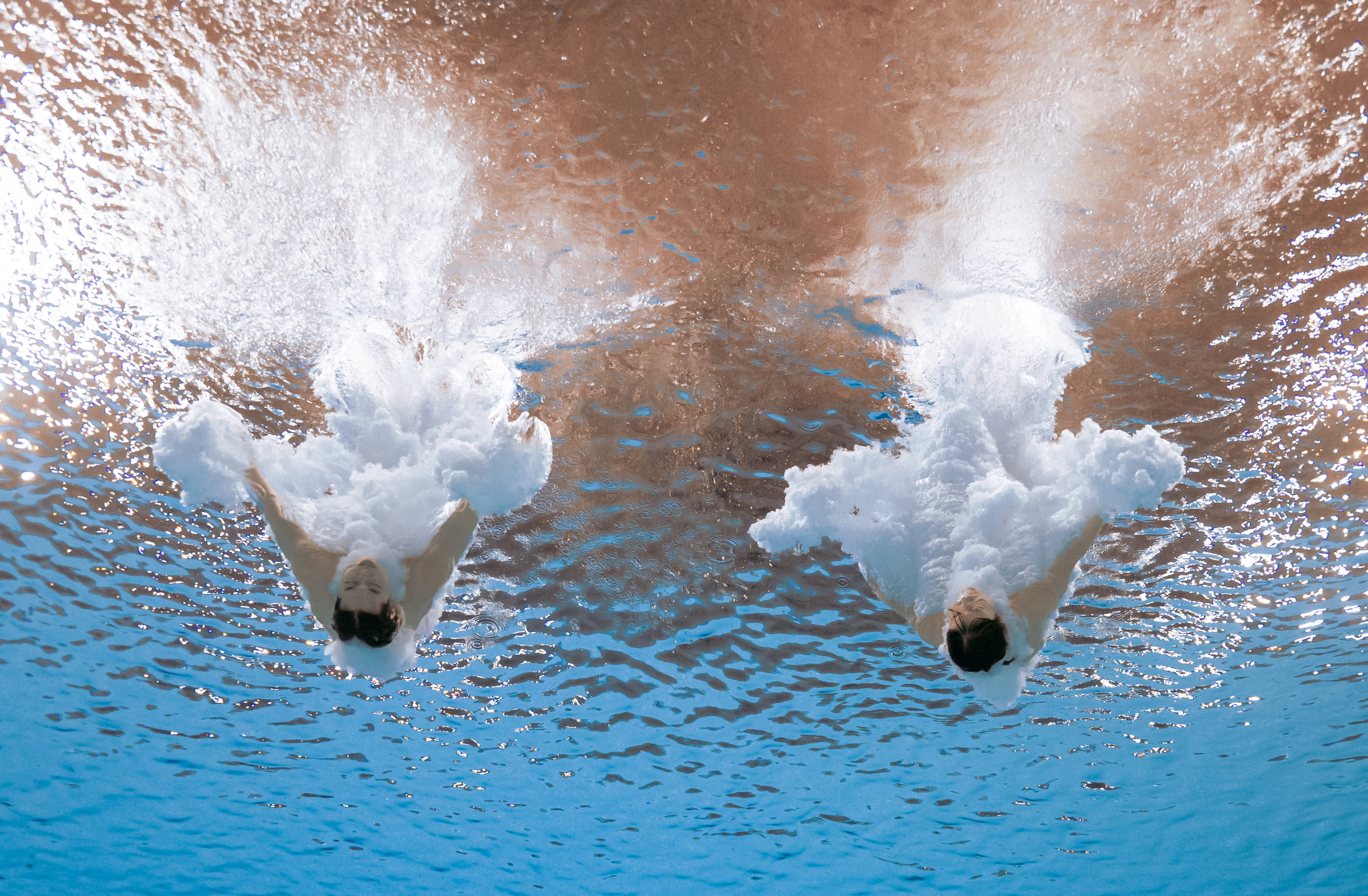 在当日率先开赛的女子团体双人3米跳板比赛中,广东队的陈艺文/林珊组合以领先第二名超14分的成绩位居第一。四川队的陈佳/杨睿琳组合与广东组合梅颖芯/欧阳钰分列二、三位。