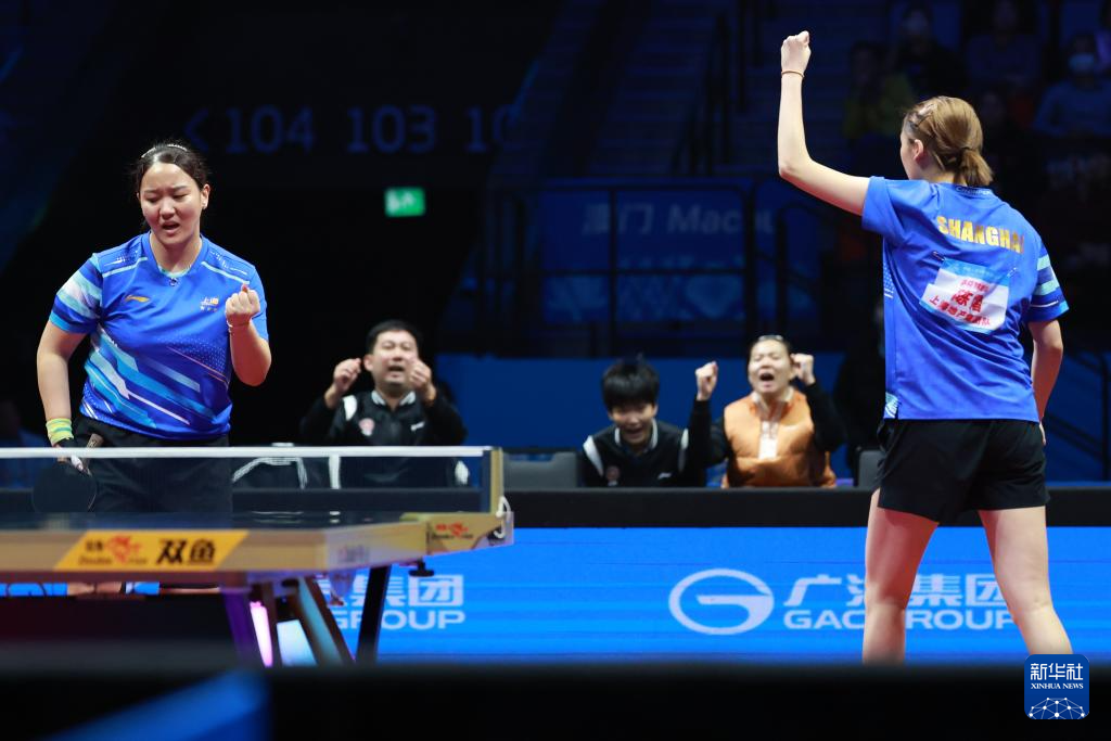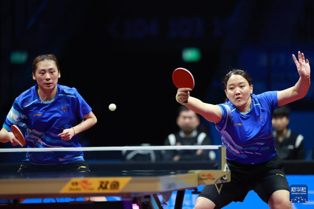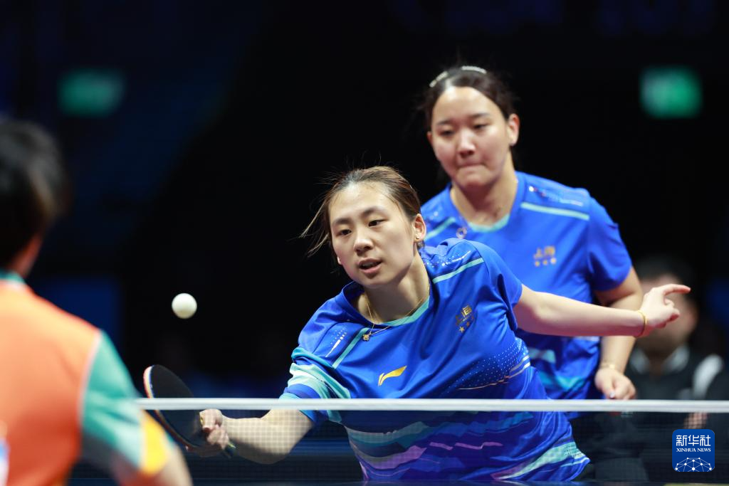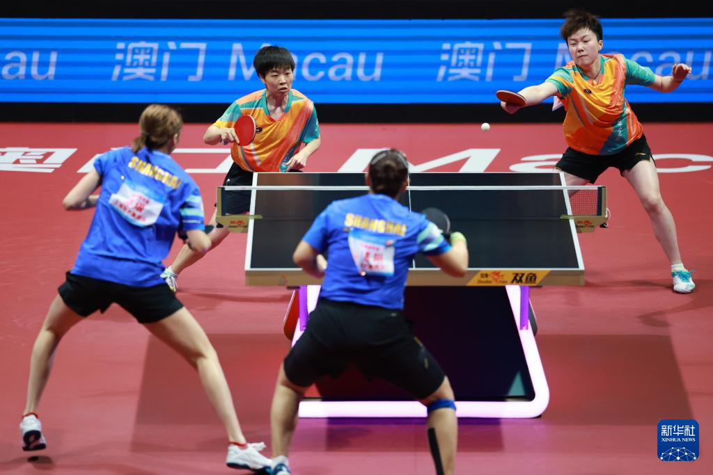 11月19日,上海队组合陈熠(左)/孙铭阳在比赛中,她们3比0战胜黑龙江队组合张瑞/范姝涵。新华社记者 梁旭 摄