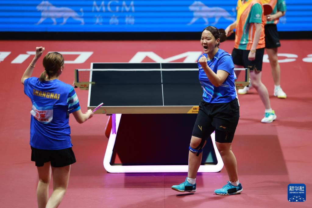 11月19日,上海队组合陈熠(右)/孙铭阳在比赛中庆祝得分,她们3比0战胜黑龙江队组合张瑞/范姝涵。新华社记者 梁旭 摄