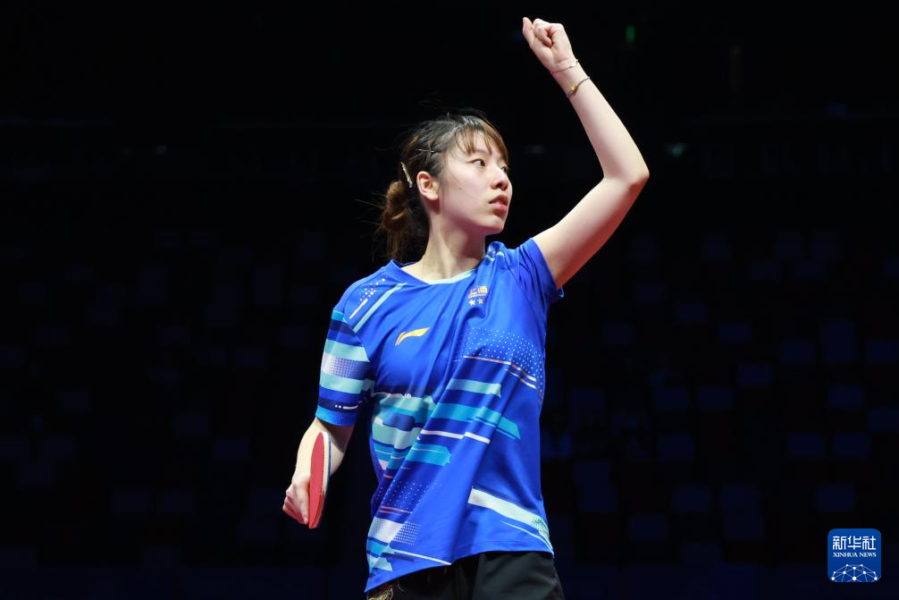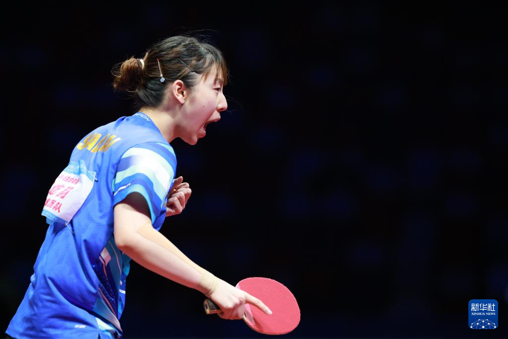 11月19日,上海队选手孙铭阳在比赛获胜后庆祝,她3比2战胜黑龙江队选手范姝涵。新华社记者 梁旭 摄