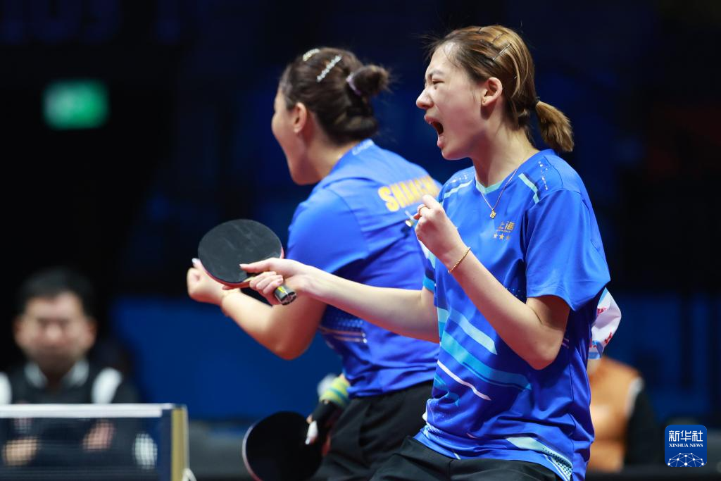 11月19日,上海队组合陈熠(右一)/孙铭阳(左一)在比赛中庆祝得分,她们3比0战胜黑龙江队组合张瑞/范姝涵。新华社记者 梁旭 摄