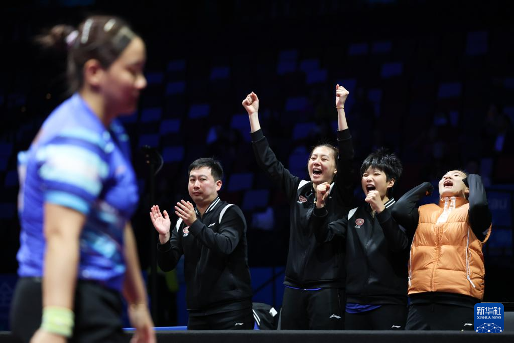 11月19日,上海队选手孙铭阳(左一)在比赛中得分后,教练和队友在场边庆祝。她3比2战胜黑龙江队选手范姝涵。新华社记者 梁旭 摄
