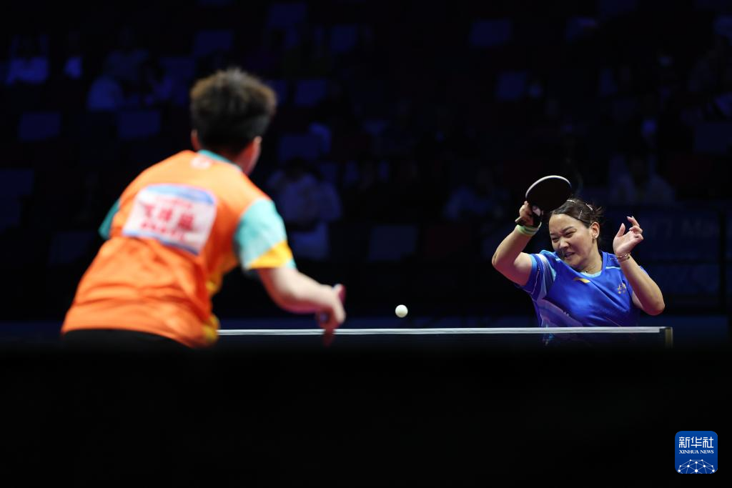 11月19日,上海队选手孙铭阳(右)在比赛中回球,她3比2战胜黑龙江队选手范姝涵。新华社记者 梁旭 摄