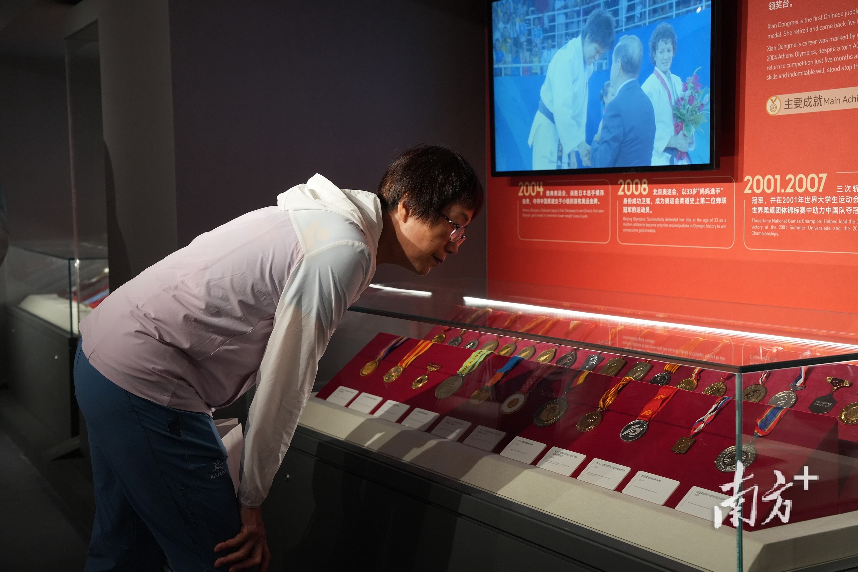 广东省体育博物馆展厅内,观众在冼东妹展柜前驻足浏览冼东妹获得的各项赛事奖牌。