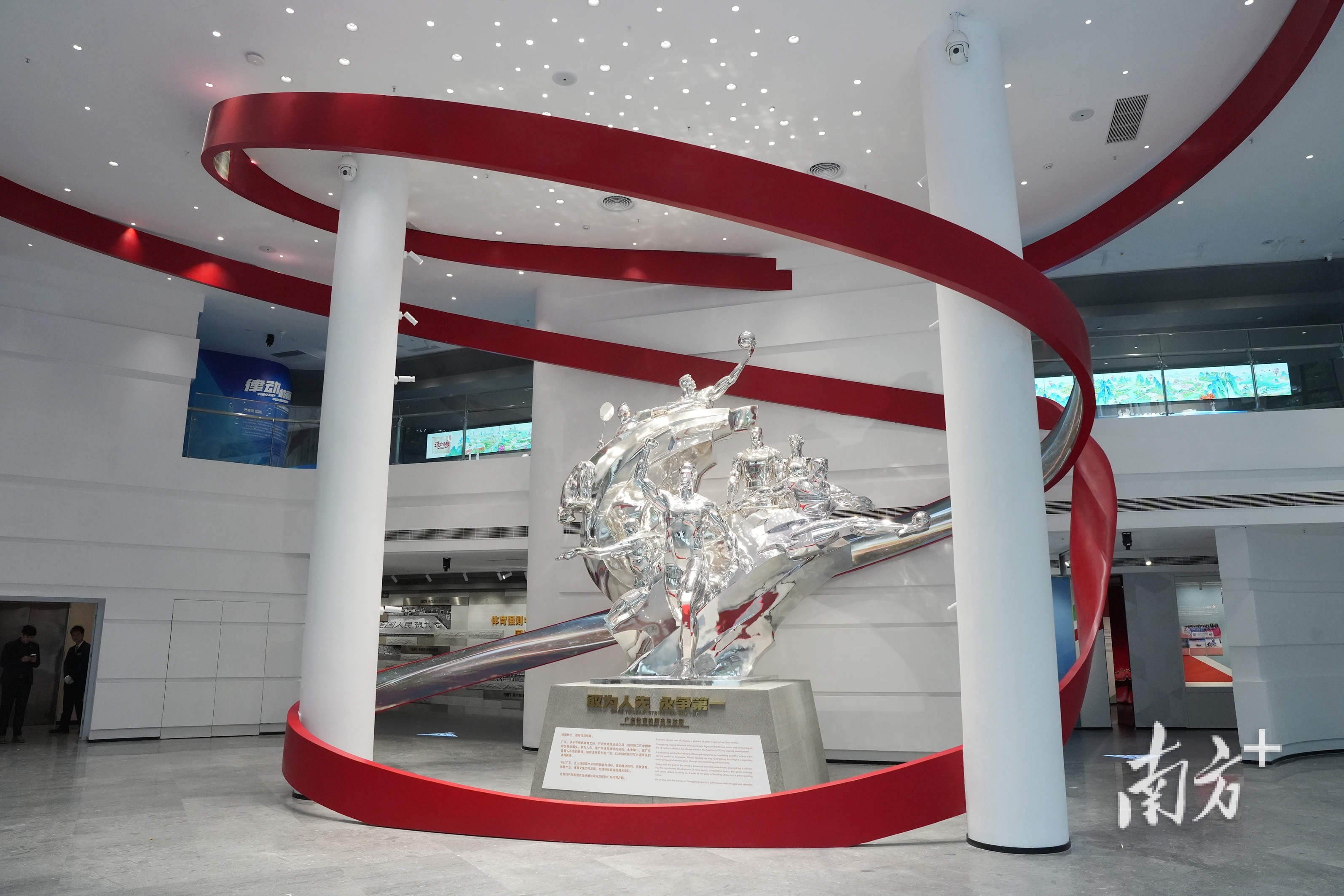 广东体育博物馆一楼大厅中心的主雕塑以广东体育健儿为创作原型,立体诠释了“敢为人先,永争第一”的精神,体现了馆内展览的核心内涵。仇敏业 摄